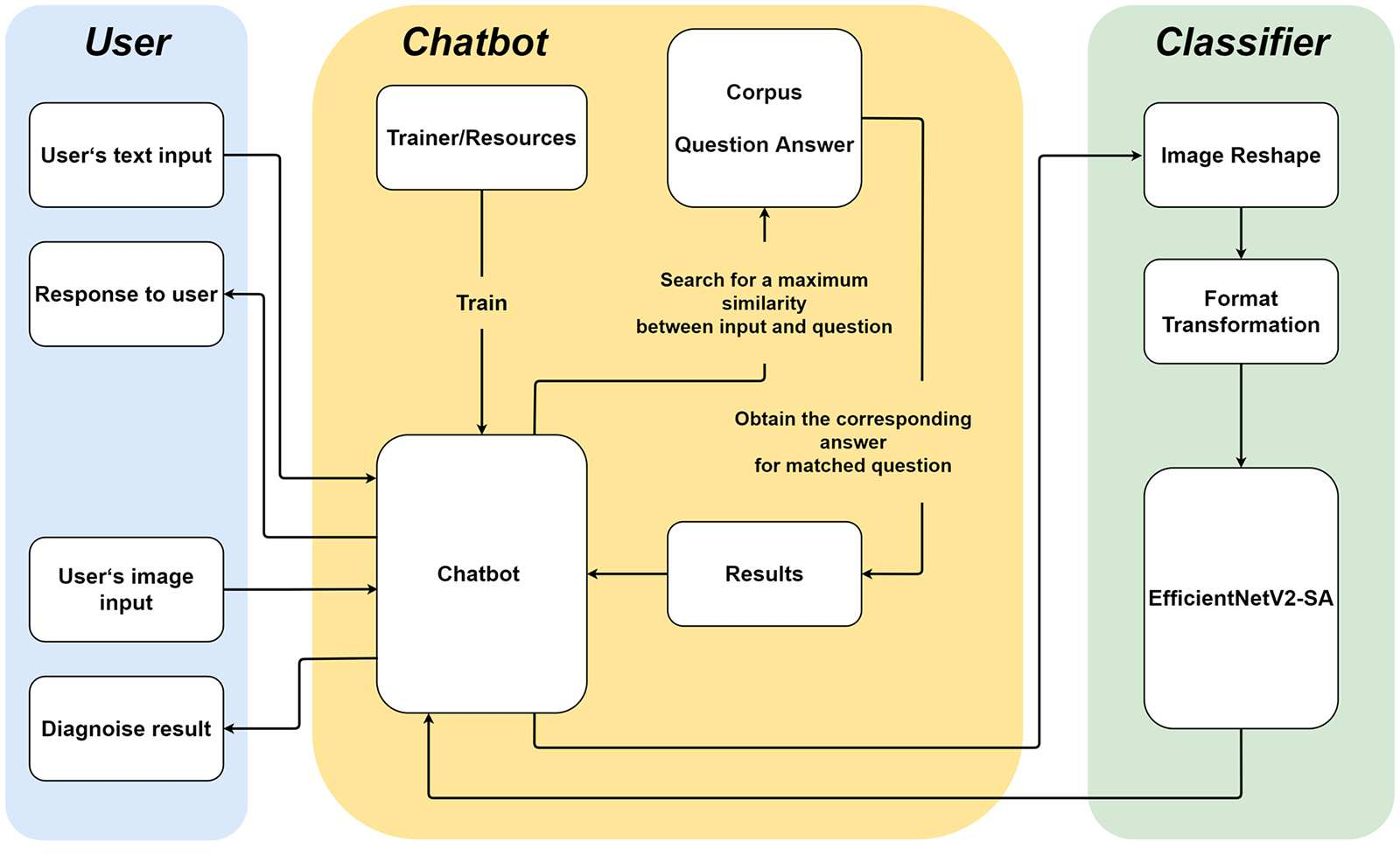This paper constructs a novel intelligent medical diagnosis system, which can realize automatic communication and breast cancer pathological image recognition. This system contains two main parts, including a pre-training chatbot called M-Chatbot and an improved neural network model of EfficientNetV2-S named EfficientNetV2-SA, in which the activation function in top layers is replaced by ACON-C. Using information retrieval mechanism, M-Chatbot instructs patients to send breast pathological image to EfficientNetV2-SA network, and then the classifier trained by transfer learning will return the diagnosis results. We verify the performance of our chatbot and classification on the extrinsic metrics and BreaKHis dataset, respectively. The task completion rate of M-Chatbot reached 63.33\%. For the BreaKHis dataset, the highest accuracy of EfficientNetV2-SA network have achieved 84.71\%. All these experimental results illustrate that the proposed model can improve the accuracy performance of image recognition and our new intelligent medical diagnosis system is successful and efficient in providing automatic diagnosis of breast cancer.