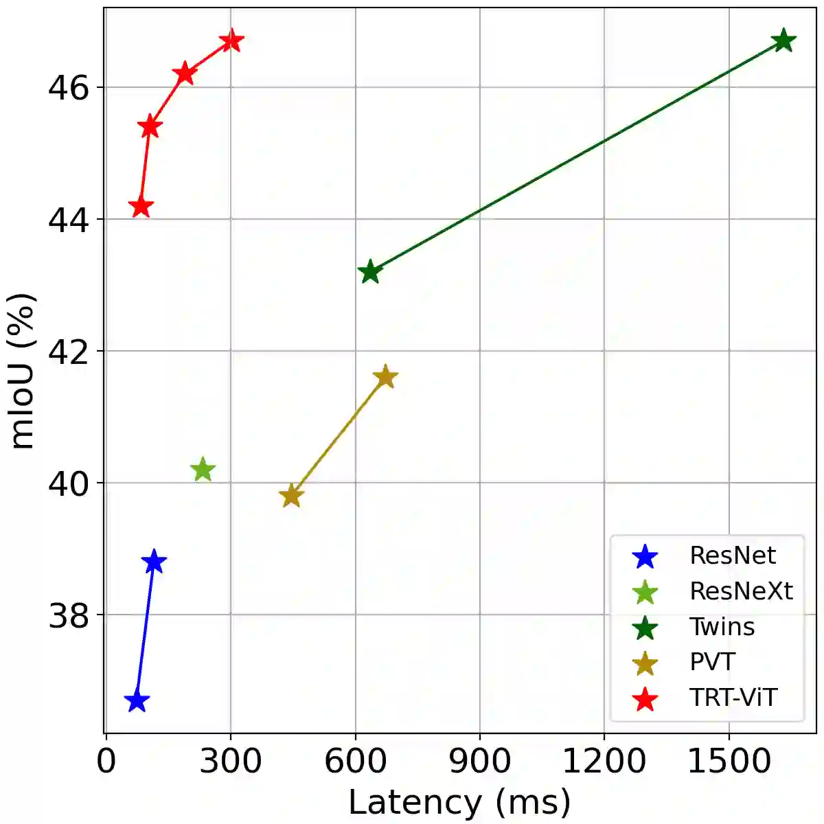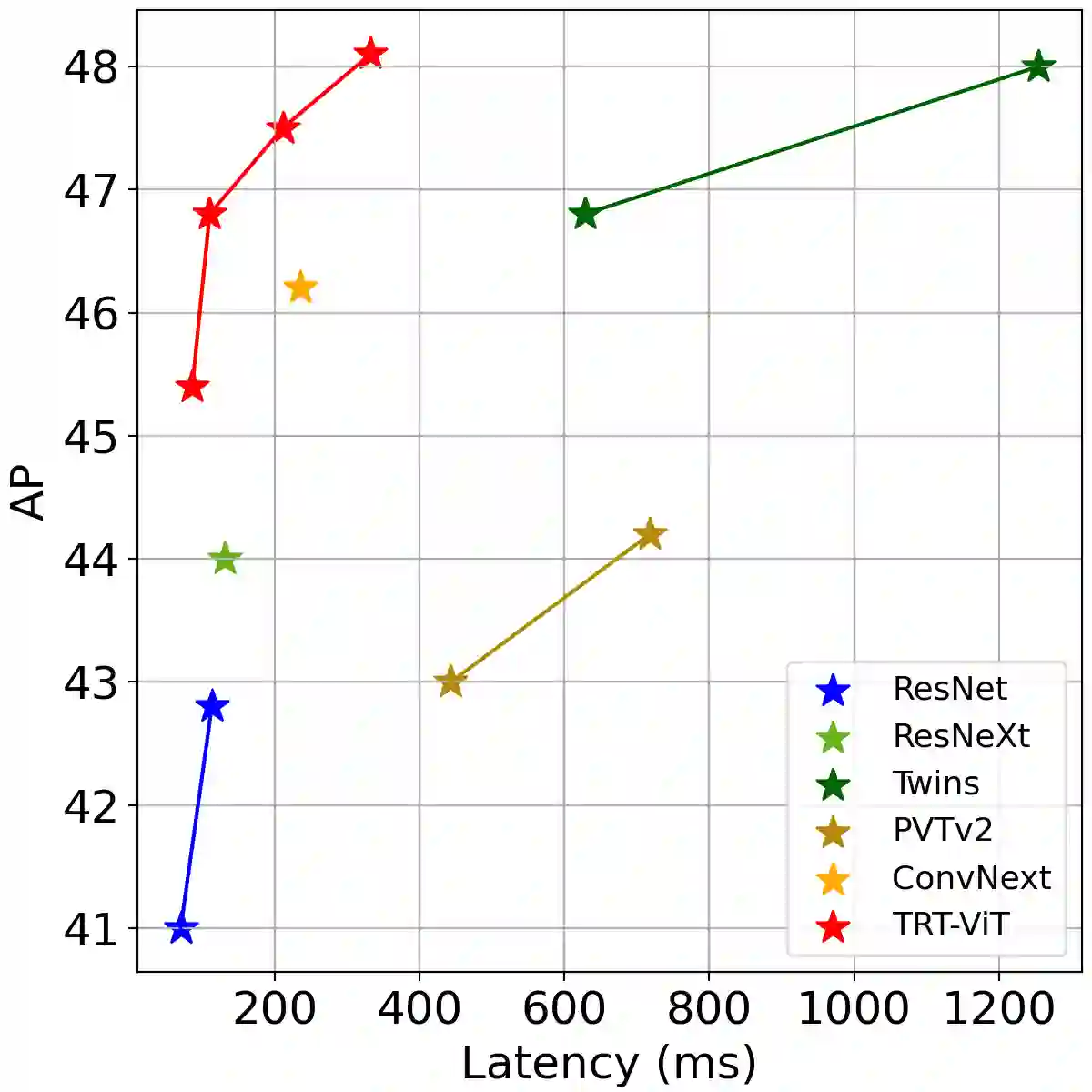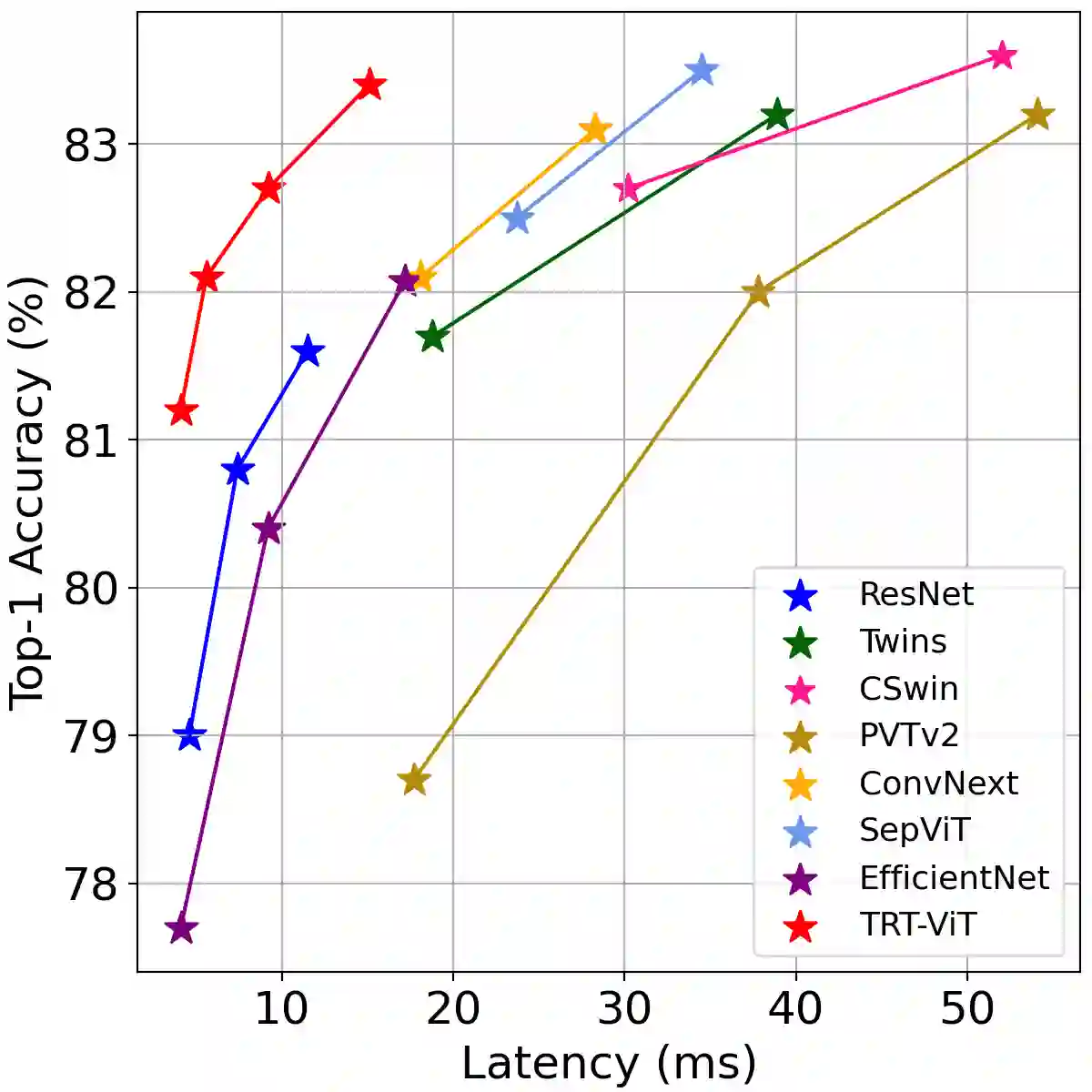 翻译:我们从实际应用的角度重新审视现有的极佳变异器。 大部分变异器甚至不如基本的 ResNet 序列那么高效, 并且偏离了现实的部署设想。 这可能是由于目前测量计算效率的标准, 如 FLOP 或参数是片面的、 亚最佳的和硬件不敏感的。 因此, 本文直接将特定硬件的TensorRT 宽度视为一种效率衡量标准, 它提供了更全面的反馈, 包括计算能力、 记忆成本和带宽。 根据一系列受控实验, 这项工作为TensorRT 和部署友好的物体网络设计提供了四个实用指南。 例如, 早期CNN 和晚变异器在阶段一级、 早期变异器和晚的CNN 。 因此, 以TensortRT 为导向的变异器组合被缩写为TRT- ViT 。 广泛的实验表明, TRT- ViT 大大超出了现有的CVEMNet 和愿景变异器, 与Lative/ centreal Trade- transal- cal- trafferationalations delations delations and lexal- lexal- legal- lex- leg- leg- laves- lex- lax- leg- lax- leg- leg- lax- lex- leg- leg- lax- lax- lex- lex- e- lex- slations- leg- leg- leg- leg- lax