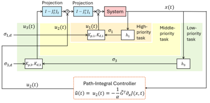 This paper addresses the problem of hierarchical task control, where a robotic system must perform multiple subtasks with varying levels of priority. A commonly used approach for hierarchical control is the null-space projection technique, which ensures that higher-priority tasks are executed without interference from lower-priority ones. While effective, the state-of-the-art implementations of this method rely on low-level controllers, such as PID controllers, which can be prone to suboptimal solutions in complex tasks. This paper presents a novel framework for hierarchical task control, integrating the null-space projection technique with the path integral control method. Our approach leverages Monte Carlo simulations for real-time computation of optimal control inputs, allowing for the seamless integration of simpler PID-like controllers with a more sophisticated optimal control technique. Through simulation studies, we demonstrate the effectiveness of this combined approach, showing how it overcomes the limitations of traditional