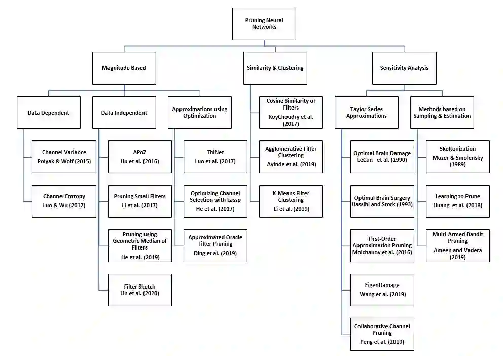 翻译:本文介绍了对深神经网络运行方法的调查,首先根据所采用的基本方法对150多项研究进行分类,然后侧重于三类:使用基于规模的运行方法,利用集群确定冗余的方法,以及使用敏感性分析评估裁剪效果的方法,这些类别中的一些影响关键研究的介绍强调了基本方法和取得的成果。大多数研究显示文献中传播的结果,这些结果随着新结构、算法和数据集的开发而随着时间的推移而发展,使得不同研究的比较变得困难。因此,本文件为社区提供了一个资源,可用于快速比较关于各种数据集的多种不同方法的结果,以及一系列结构,包括AlexNet、ResNet、DenseNet和VGG。通过比较关于图像网络和ResNet56和VGG16的PRONet50和ResNet56和VGG10数据公布的结果,以揭示哪些方法在保持准确性并实现良好压缩率方面效果良好。文件的结论是,确定了未来研究的一些有希望的方向。