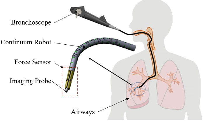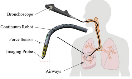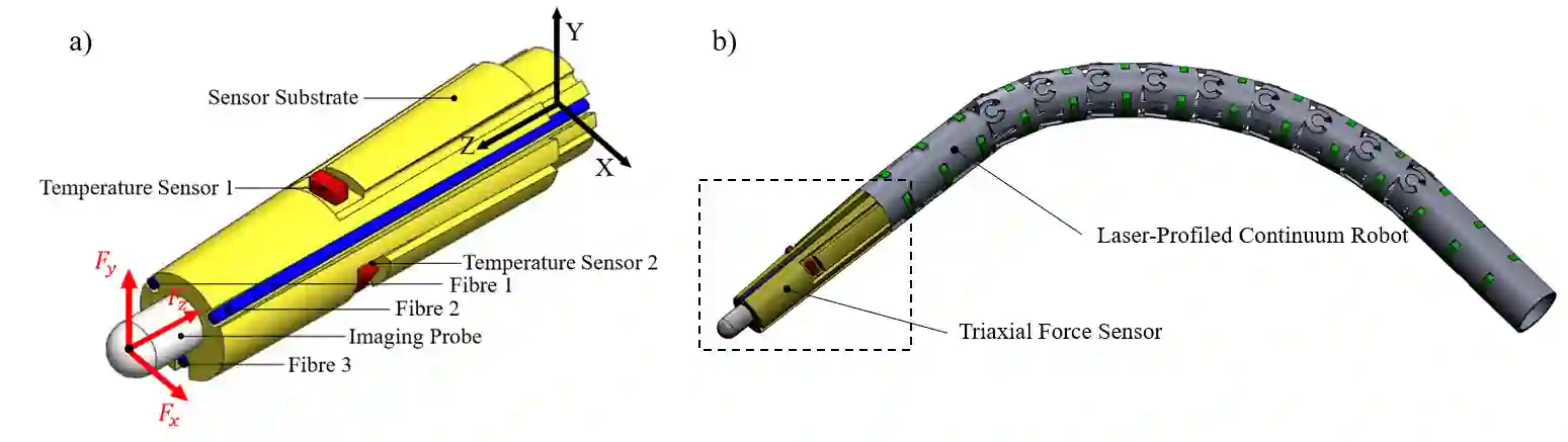 翻译:精密力感应对于内光干预在安全和损伤目标方面都很重要。本文通过在锥形基底的横向侧方配置三个FBG传感器,开发一个基于FBG的机器人支气管检查动力感应器。它允许用于干预仪器的大型和以偏心心心内润滑,使内部有一个灵活的成像探测器能够进行光学生物检查。力感应器由激光显示的连续连续连续机器人组成,热漂移由传感器基质环绕表面的三个温度感应器充分补偿。对不同的脱钩方法进行了调查,并根据SVM和高斯内核的交叉校准功能采用了非线性脱钩功能,分别实现了X、Y和Z轴10.58米N、14.57米N和26.32米N的精确度。还调查了组织测试,以进一步证明已开发的三轴力传感器的可行性。
