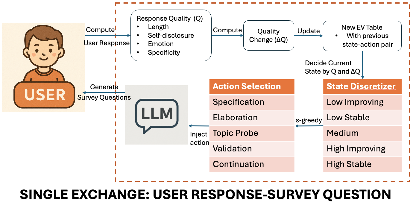 Conventional online surveys provide limited personalization, often resulting in low engagement and superficial responses. Although AI survey chatbots improve convenience, most are still reactive: they rely on fixed dialogue trees or static prompt templates and therefore cannot adapt within a session to fit individual users, which leads to generic follow-ups and weak response quality. We address these limitations with AURA (Adaptive Understanding through Reinforcement Learning for Assessment), a reinforcement learning framework for AI-driven adaptive conversational surveys. AURA quantifies response quality using a four-dimensional LSDE metric (Length, Self-disclosure, Emotion, and Specificity) and selects follow-up question types via an epsilon-greedy policy that updates the expected quality gain within each session. Initialized with priors extracted from 96 prior campus-climate conversations (467 total chatbot-user exchanges), the system balances exploration and exploitation across 10-15 dialogue exchanges, dynamically adapting to individual participants in real time. In controlled evaluations, AURA achieved a +0.12 mean gain in response quality and a statistically significant improvement over non-adaptive baselines (p=0.044, d=0.66), driven by a 63% reduction in specification prompts and a 10x increase in validation behavior. These results demonstrate that reinforcement learning can give survey chatbots improved adaptivity, transforming static questionnaires into interactive, self-improving assessment systems.