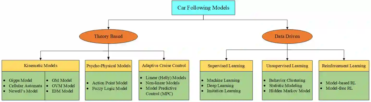 Car-following (CF) algorithms are crucial components of traffic simulations and have been integrated into many production vehicles equipped with Advanced Driving Assistance Systems (ADAS). Insights from the model of car-following behavior help us understand the causes of various macro phenomena that arise from interactions between pairs of vehicles. Car-following models encompass multiple disciplines, including traffic engineering, physics, dynamic system control, cognitive science, machine learning, and reinforcement learning. This paper presents an extensive survey that highlights the differences, complementarities, and overlaps among microscopic traffic flow and control models based on their underlying principles and design logic. It reviews representative algorithms, ranging from theory-based kinematic models, Psycho-Physical Models, and Adaptive cruise control models to data-driven algorithms like Reinforcement Learning and Imitation Learning (IL). The manuscript discusses the strengths and limitations of these models and explores their applications in different contexts. This review synthesizes existing researches across different domains to fill knowledge gaps and offer guidance for future research by identifying the latest trends in car following models and their applications.