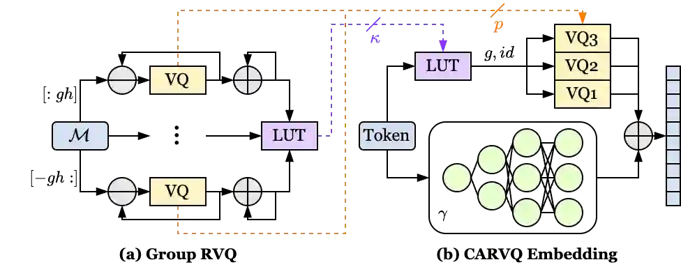 翻译:大语言模型通常依赖大量参数进行词元嵌入,导致巨大的存储需求和内存占用。特别是在边缘设备上部署的LLMs受限于内存,通过压缩嵌入层来减少内存占用不仅能释放内存带宽,还能加速推理。为此,我们提出CARVQ,一种结合分组残差向量量化的后训练新型校正适配器。CARVQ依赖于线性和非线性映射的组合,通过模拟原始模型嵌入实现约1.6比特的压缩,且无需专用硬件支持低位存储。我们在LLaMA-3.2-1B、LLaMA-3.2-3B、LLaMA-3.2-3B-Instruct、LLaMA-3.1-8B、Qwen2.5-7B、Qwen2.5-Math-7B和Phi-4等预训练大语言模型上测试了该方法,并在常见生成式、判别式、数学和推理任务上进行了评估。结果表明,在多数情况下,与标量量化相比,CARVQ能以更低的平均每参数比特数保持合理的困惑度和准确率。我们的贡献包括一种与先进Transformer量化方法兼容的新型压缩技术,可无缝集成到任何支持4位内存的硬件中,从而降低内存受限设备的模型内存占用。这项工作为实现大语言模型在边缘设备上的高效部署迈出了关键一步。