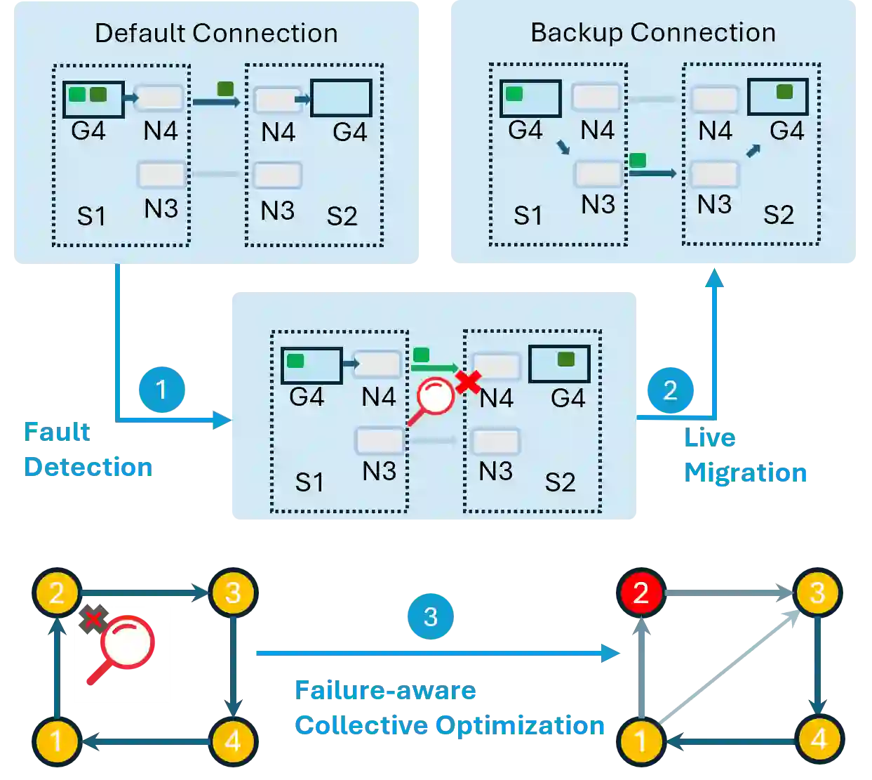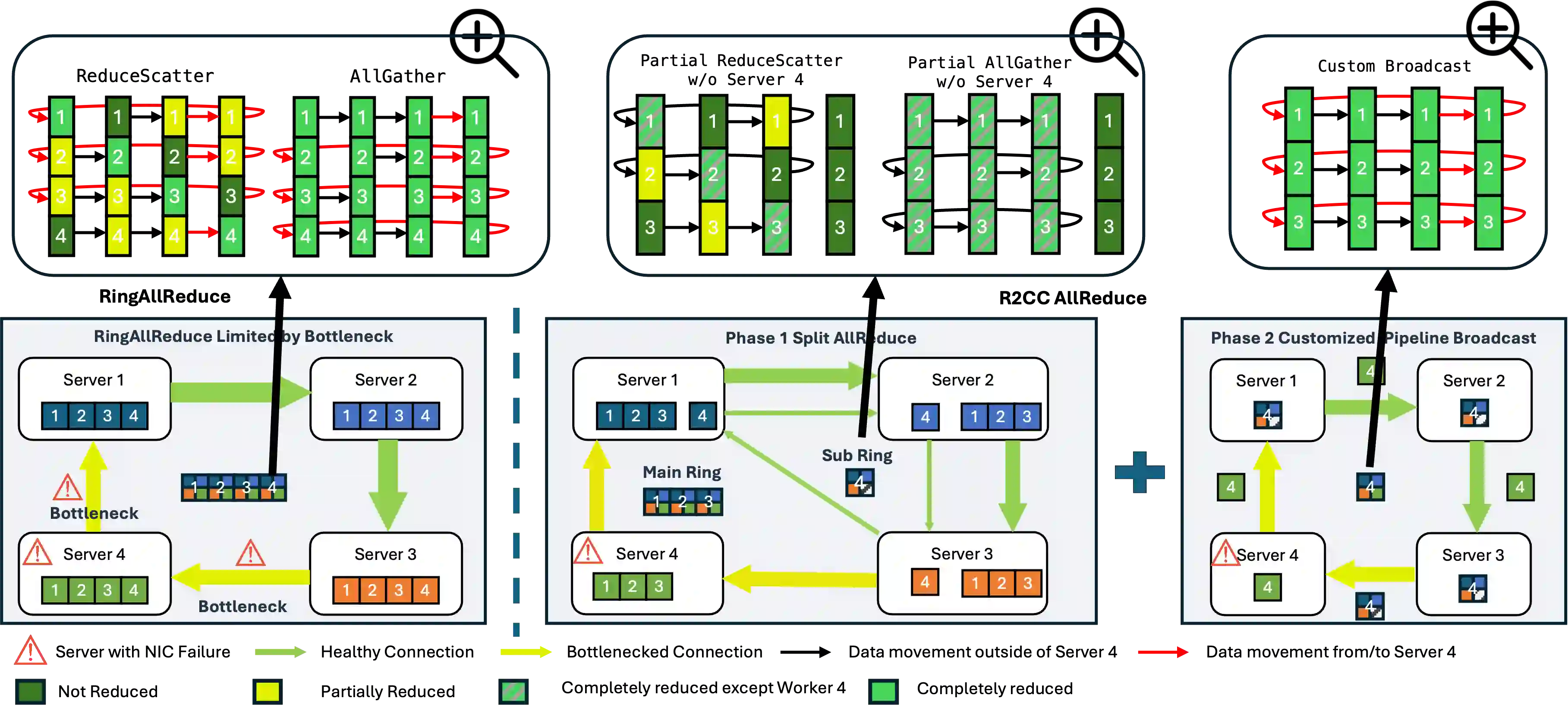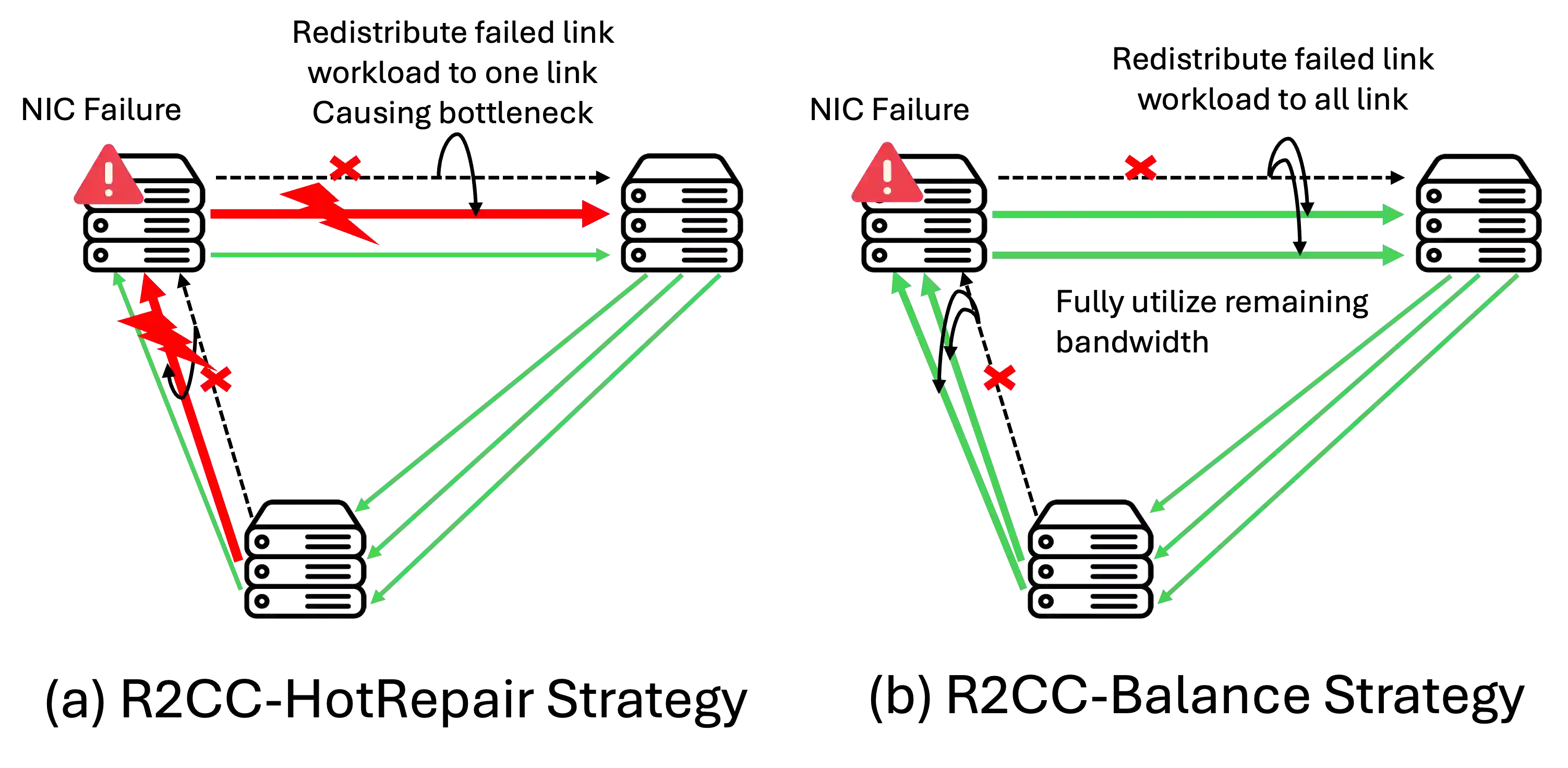 翻译:现代机器学习训练与推理任务现已扩展至数十至数万块GPU的规模,其中网络故障可因恢复缓慢导致10-15%的GPU时被浪费。常见的网络错误与链路波动会触发超时机制,往往导致整个作业终止,迫使训练过程中进行昂贵的检查点回滚,并在推理时重新处理请求。本文提出R$^2$CCL——一种通过利用多网卡硬件实现无损低开销故障转移的容错通信库。R$^2$CCL通过快速连接迁移、带宽感知的负载重分布以及弹性集体算法,在故障发生时维持任务进展。我们在两台配备8块H100 GPU的InfiniBand服务器上,以及通过模拟数百块GPU并包含多种故障模式的大规模机器学习仿真器中对R$^2$CCL进行了评估。实验表明,R$^2$CCL对网卡故障具有高度鲁棒性,产生的训练开销低于1%,推理开销低于3%。R$^2$CCL分别以12.18$\times$和47$\times$的优势超越了基线方法AdapCC与DejaVu。