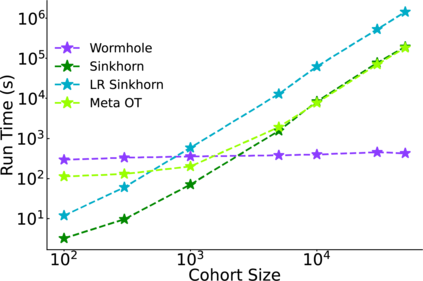 Optimal transport (OT) and the related Wasserstein metric (W) are powerful and ubiquitous tools for comparing distributions. However, computing pairwise Wasserstein distances rapidly becomes intractable as cohort size grows. An attractive alternative would be to find an embedding space in which pairwise Euclidean distances map to OT distances, akin to standard multidimensional scaling (MDS). We present Wasserstein Wormhole, a transformer-based autoencoder that embeds empirical distributions into a latent space wherein Euclidean distances approximate OT distances. Extending MDS theory, we show that our objective function implies a bound on the error incurred when embedding non-Euclidean distances. Empirically, distances between Wormhole embeddings closely match Wasserstein distances, enabling linear time computation of OT distances. Along with an encoder that maps distributions to embeddings, Wasserstein Wormhole includes a decoder that maps embeddings back to distributions, allowing for operations in the embedding space to generalize to OT spaces, such as Wasserstein barycenter estimation and OT interpolation. By lending scalability and interpretability to OT approaches, Wasserstein Wormhole unlocks new avenues for data analysis in the fields of computational geometry and single-cell biology.