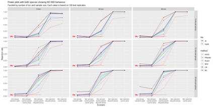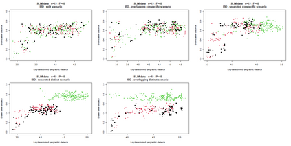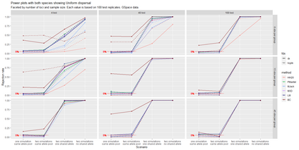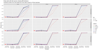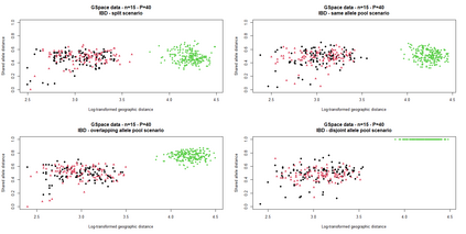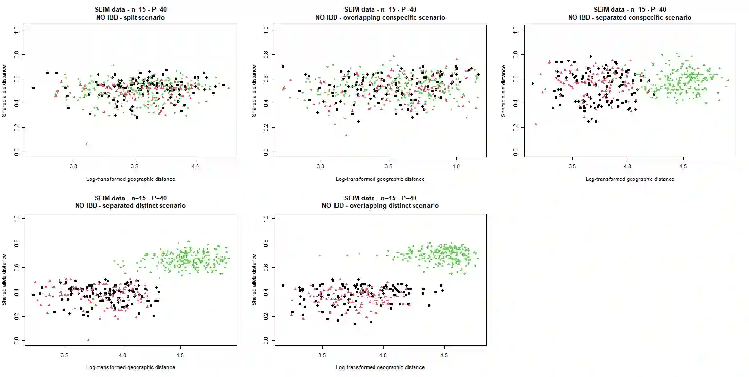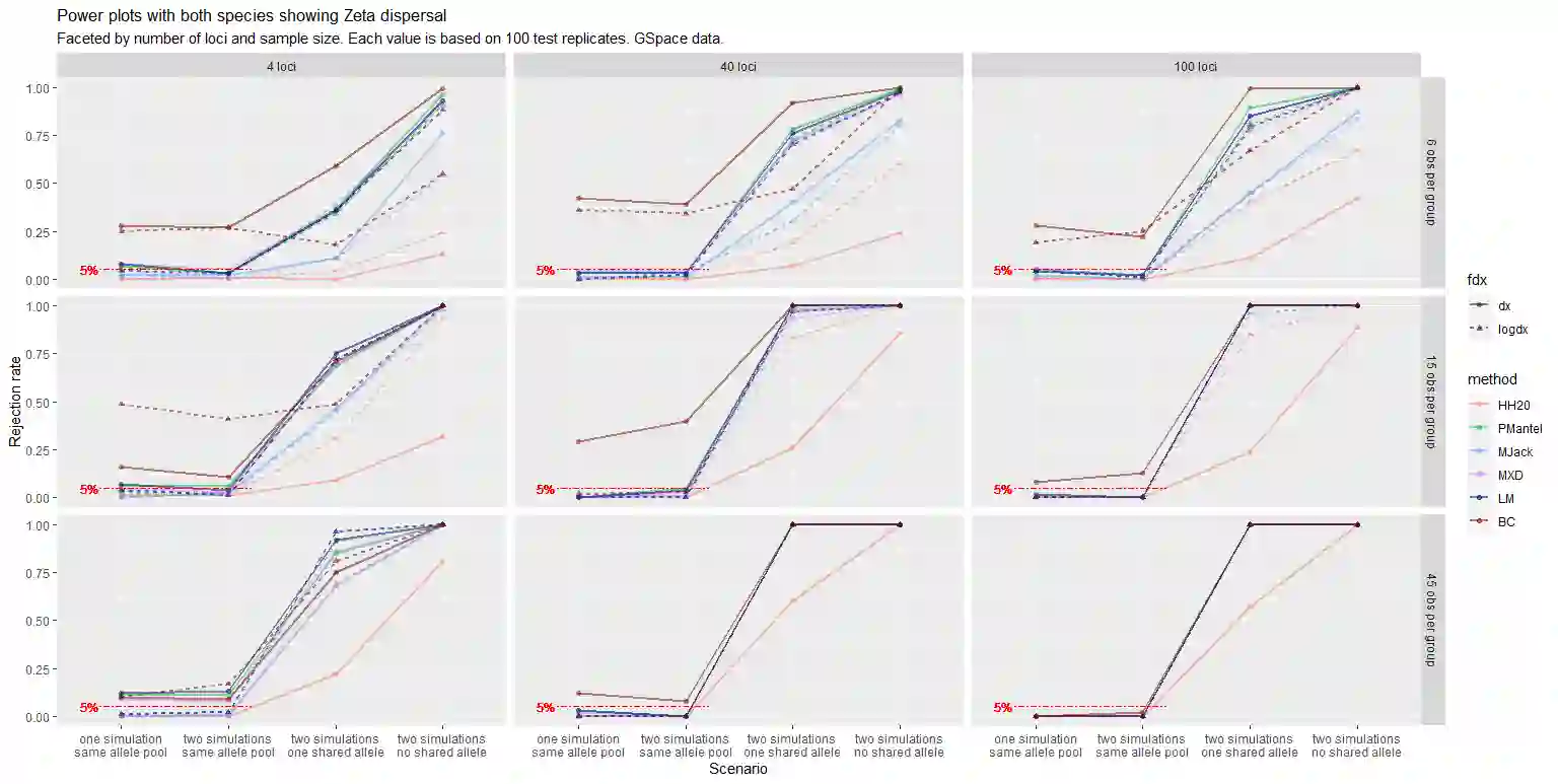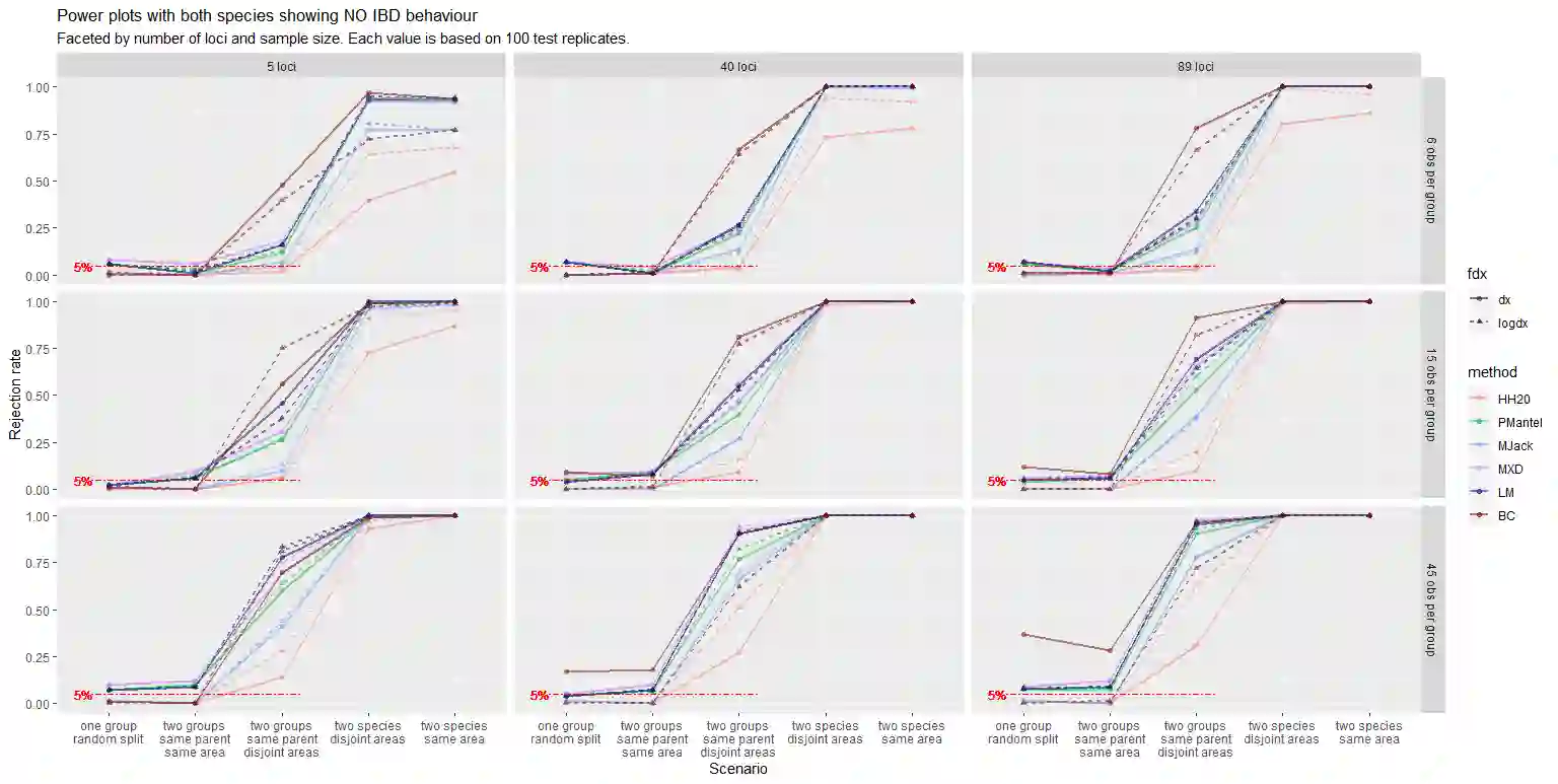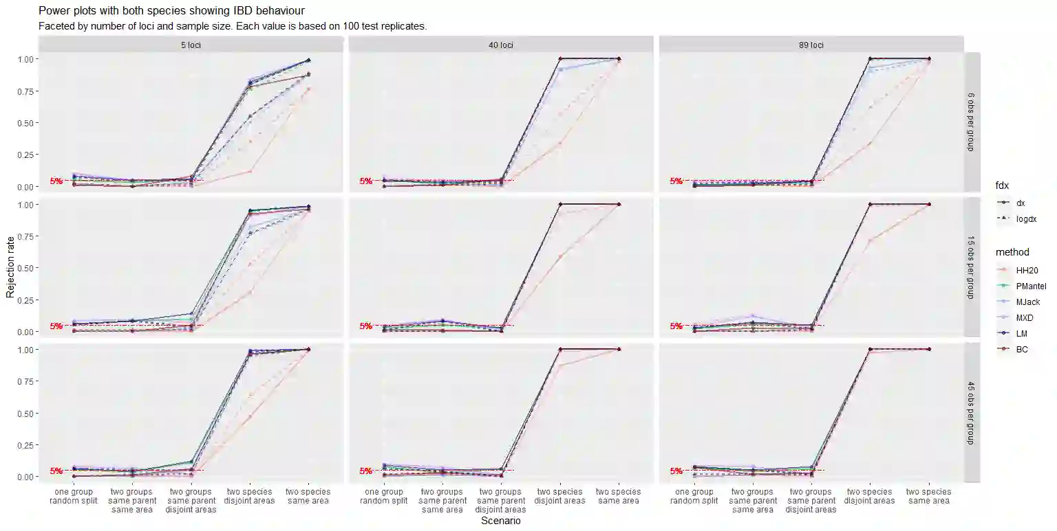 The delimitation of biological species, i.e., deciding which individuals belong to the same species and whether and how many different species are represented in a data set, is key to the conservation of biodiversity. Much existing work uses only genetic data for species delimitation, often employing some kind of cluster analysis. This can be misleading, because geographically distant groups of individuals can be genetically quite different even if they belong to the same species. This paper investigates the problem of testing whether two potentially separated groups of individuals can belong to a single species or not based on genetic and spatial data. Various approaches are compared (some of which already exist in the literature) based on simulated metapopulations generated with SLiM and GSpace - two software packages that can simulate spatially-explicit genetic data at an individual level. Approaches involve partial Mantel testing, maximum likelihood mixed-effects models with a population effect, and jackknife-based homogeneity tests. A key challenge is that most tests perform on genetic and geographical distance data, violating standard independence assumptions. Simulations showed that partial Mantel tests and mixed-effects models have larger power than jackknife-based methods, but tend to display type-I-error rates slightly above the significance level. Moreover, a multiple regression model neglecting the dependence in the dissimilarities did not show inflated type-I-error rate. An application on brassy ringlets concludes the paper.
