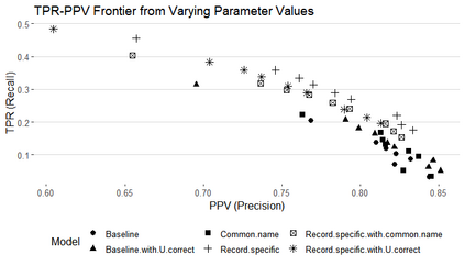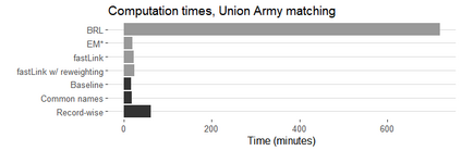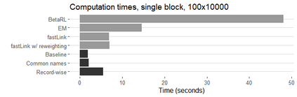 翻译:研究人员往往有兴趣将个人连接到两个缺乏共同独特识别特征的数据集之间。 匹配程序往往难以使记录与共同名称、出生地或其他字段值相匹配。 计算可行性也是一个挑战,特别是在连接大型数据集时。 我们开发了一种巴伊西亚自动概率记录连接方法,显示它回收了50%以上的真实匹配,保持准确性,比可比方法多出50%以上,将军事招募数据与1900年有专家标签匹配的美国普查相匹配。 我们的方法以最新最先进的巴伊西亚方法为基础,完善了比较数据的建模,允许以非匹配状态为条件的分歧概率参数在两个数据集的较小部分具有特定记录特性。这种灵活性在很多记录共享共同字段值时大大改进了匹配。 我们表明,我们的方法在实际中是可行的,尽管增加了复杂性,但R/C++的落实速度大大高于可比较的近期方法。 我们还建议一种较轻的处理非常常见名称的方法,并表明在无法真正匹配的情况下如何估计真实的积极率和积极预测值。