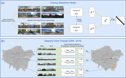 Cities around the world face a critical shortage of affordable and decent housing. Despite its critical importance for policy, our ability to effectively monitor and track progress in urban housing is limited. Deep learning-based computer vision methods applied to street-level images have been successful in the measurement of socioeconomic and environmental inequalities but did not fully utilize temporal images to track urban change as time-varying labels are often unavailable. We used self-supervised methods to measure change in London using 15 million street images taken between 2008 and 2021. Our novel adaptation of Barlow Twins, Street2Vec, embeds urban structure while being invariant to seasonal and daily changes without manual annotations. It outperformed generic embeddings, successfully identified point-level change in London's housing supply from street-level images, and distinguished between major and minor change. This capability can provide timely information for urban planning and policy decisions toward more liveable, equitable, and sustainable cities.