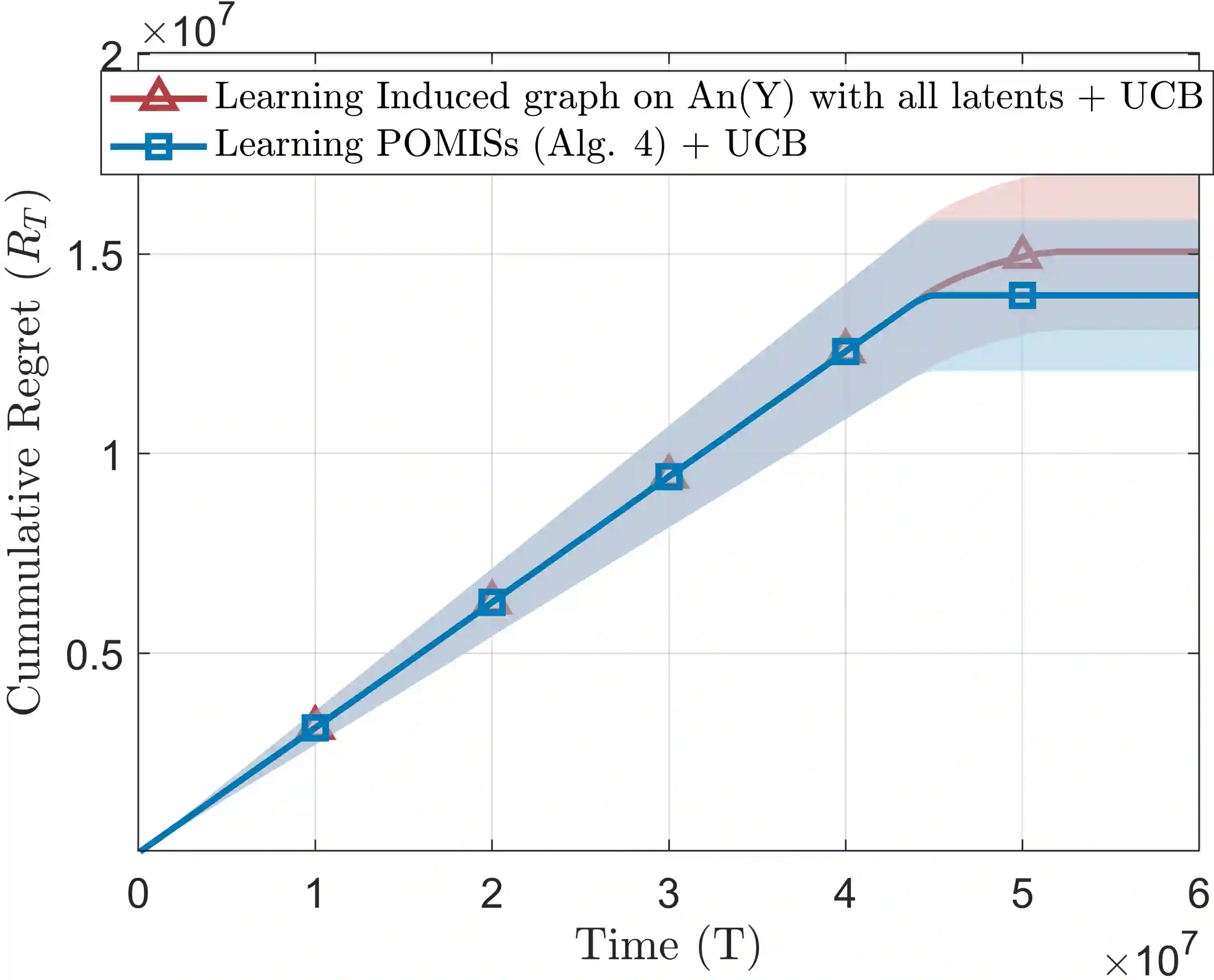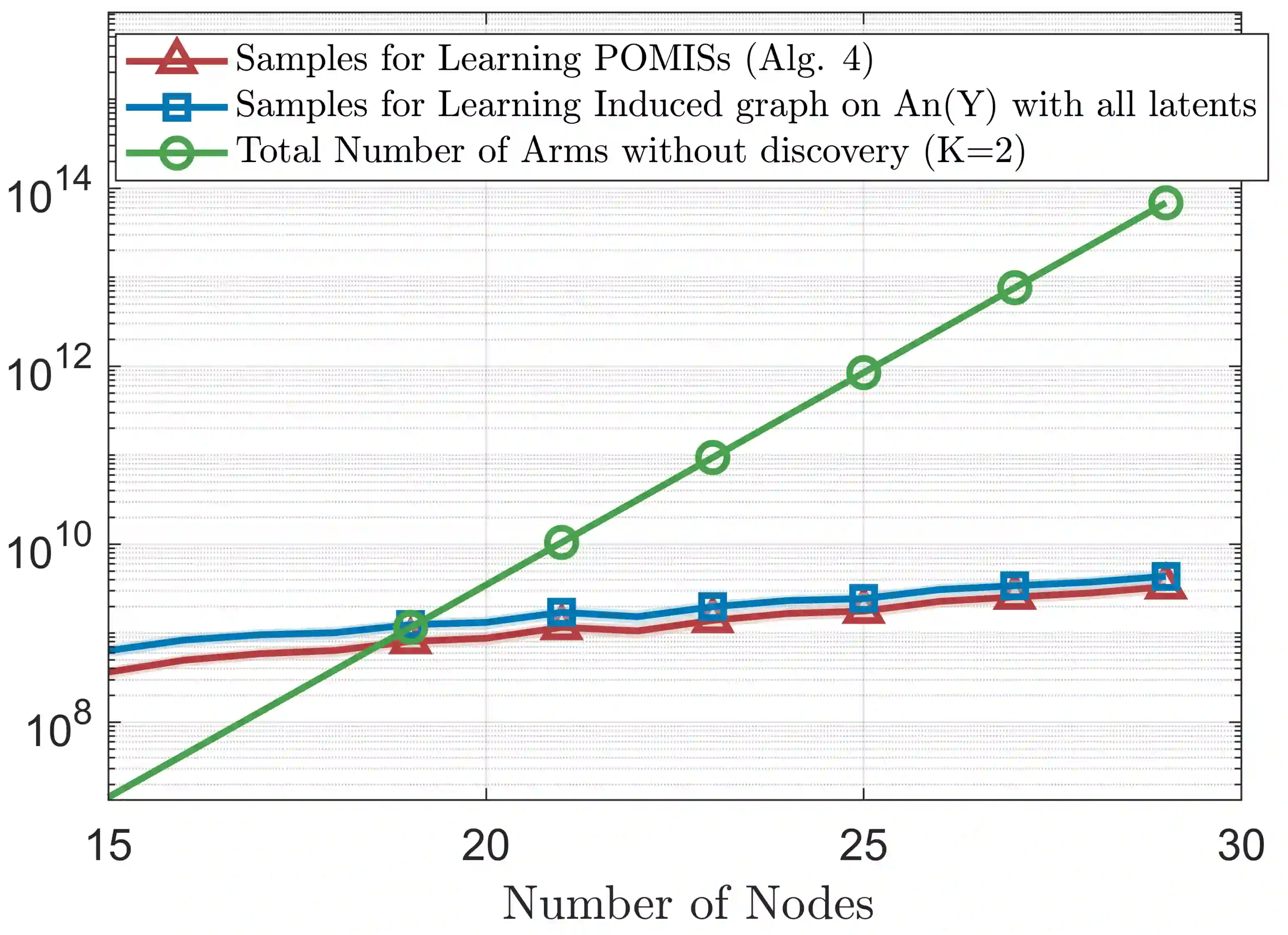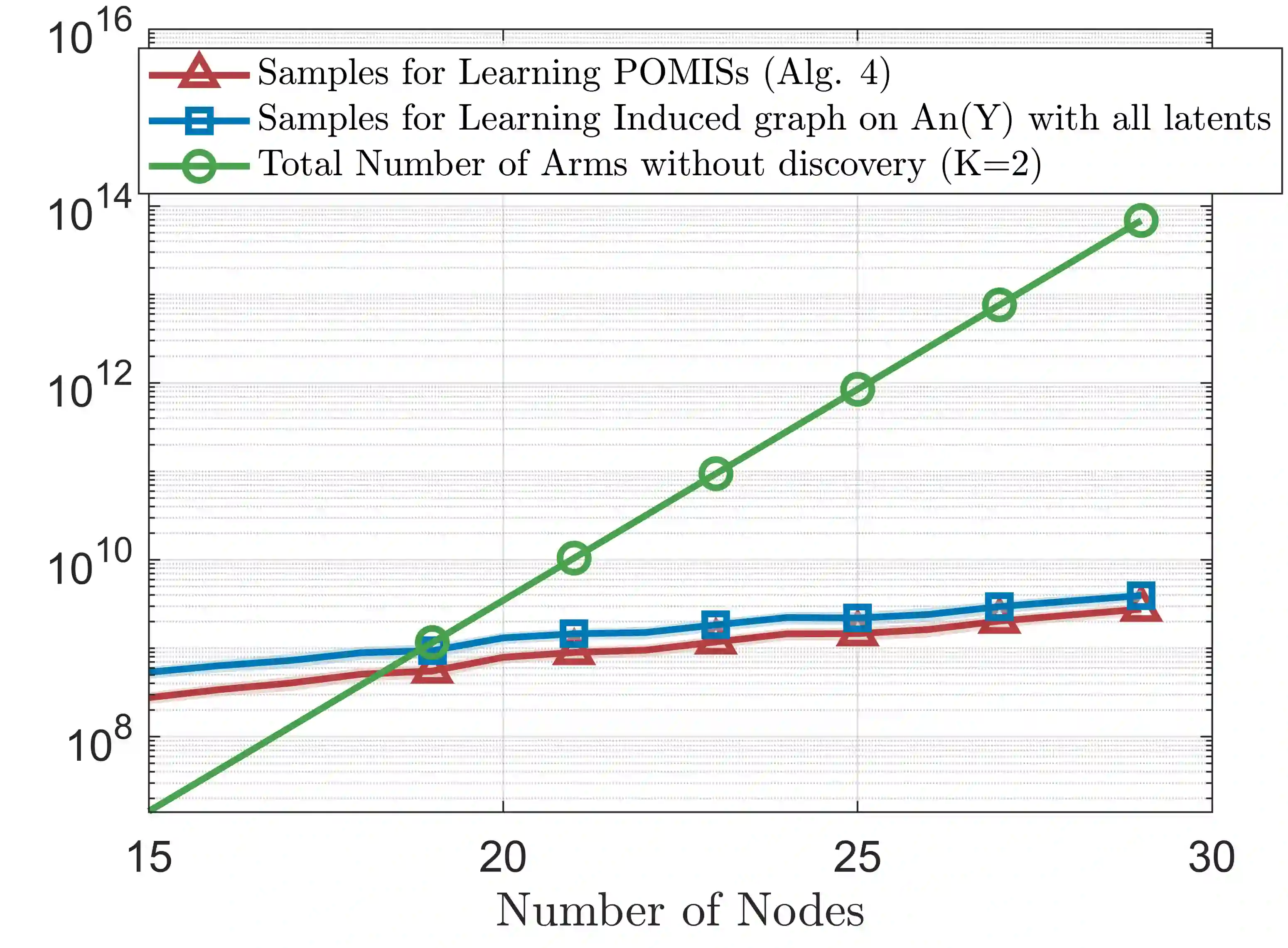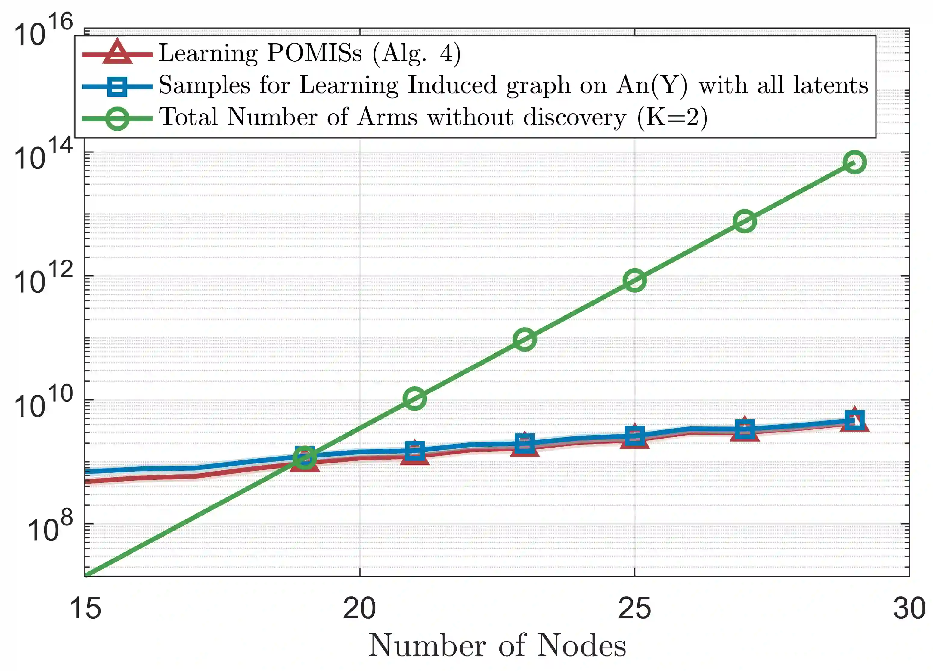 Causal knowledge about the relationships among decision variables and a reward variable in a bandit setting can accelerate the learning of an optimal decision. Current works often assume the causal graph is known, which may not always be available a priori. Motivated by this challenge, we focus on the causal bandit problem in scenarios where the underlying causal graph is unknown and may include latent confounders. While intervention on the parents of the reward node is optimal in the absence of latent confounders, this is not necessarily the case in general. Instead, one must consider a set of possibly optimal arms/interventions, each being a special subset of the ancestors of the reward node, making causal discovery beyond the parents of the reward node essential. For regret minimization, we identify that discovering the full causal structure is unnecessary; however, no existing work provides the necessary and sufficient components of the causal graph. We formally characterize the set of necessary and sufficient latent confounders one needs to detect or learn to ensure that all possibly optimal arms are identified correctly. We also propose a randomized algorithm for learning the causal graph with a limited number of samples, providing a sample complexity guarantee for any desired confidence level. In the causal bandit setup, we propose a two-stage approach. In the first stage, we learn the induced subgraph on ancestors of the reward, along with a necessary and sufficient subset of latent confounders, to construct the set of possibly optimal arms. The regret incurred during this phase scales polynomially with respect to the number of nodes in the causal graph. The second phase involves the application of a standard bandit algorithm, such as the UCB algorithm. We also establish a regret bound for our two-phase approach, which is sublinear in the number of rounds.