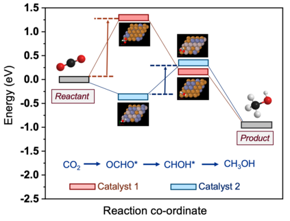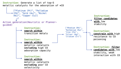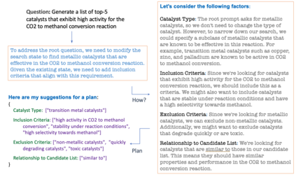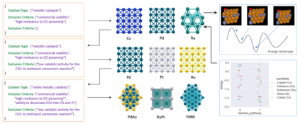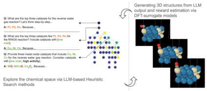 The discovery of new catalysts is essential for the design of new and more efficient chemical processes in order to transition to a sustainable future. We introduce an AI-guided computational screening framework unifying linguistic reasoning with quantum-chemistry based feedback from 3D atomistic representations. Our approach formulates catalyst discovery as an uncertain environment where an agent actively searches for highly effective catalysts via the iterative combination of large language model (LLM)-derived hypotheses and atomistic graph neural network (GNN)-derived feedback. Identified catalysts in intermediate search steps undergo structural evaluation based on spatial orientation, reaction pathways, and stability. Scoring functions based on adsorption energies and barriers steer the exploration in the LLM's knowledge space toward energetically favorable, high-efficiency catalysts. We introduce planning methods that automatically guide the exploration without human input, providing competitive performance against expert-enumerated chemical descriptor-based implementations. By integrating language-guided reasoning with computational chemistry feedback, our work pioneers AI-accelerated, trustworthy catalyst discovery.