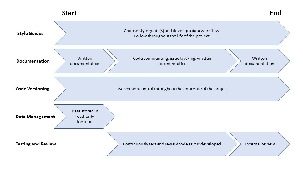 The world is becoming increasingly complex, both in terms of the rich sources of data we have access to as well as in terms of the statistical and computational methods we can use on those data. These factors create an ever-increasing risk for errors in our code and sensitivity in our findings to data preparation and execution of complex statistical and computing methods. The consequences of coding and data mistakes can be substantial. Openness (e.g., providing others with data code) and transparency (e.g., requiring that data processing and code follow standards) are two key solutions to help alleviate concerns about replicability and errors. In this paper, we describe the key steps for implementing a code quality assurance (QA) process for researchers to follow to improve their coding practices throughout a project to assure the quality of the final data, code, analyses and ultimately the results. These steps include: (i) adherence to principles for code writing and style that follow best practices, (ii) clear written documentation that describes code, workflow and key analytic decisions; (iii) careful version control, (iv) good data management; and (iv) regular testing and review. Following all these steps will greatly improve the ability of a study to assure results are accurate and reproducible. The responsibility for code QA falls not only on individual researchers but institutions, journals, and funding agencies as well.