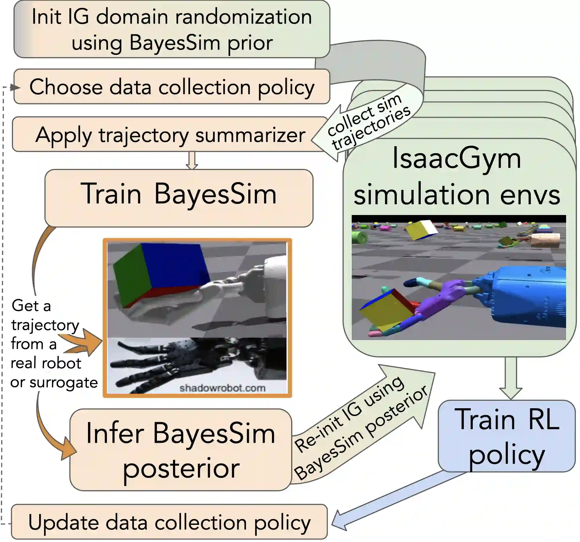 翻译:BayesSim是一种根据模拟参数的无概率推断,在强化学习中进行域随机化的统计技术。本文概述了BayesSimIG:一个提供BayesSim与最近发行的NVIDIA IsaacGym集成的图书馆。这种结合可以使用端到端GPU加速度进行大型参数推断。两种推论和模拟都加速了GPU,支持运行超过10K的平行模拟环境,用于可估计超过100个模拟参数的复杂机器人任务。BayesSimIG提供了与TensorBoard的集成,以易于视觉化高维外层片。图书馆以模块方式建成,以支持研究实验,以新的方式收集和处理平行的IsacGym环境的轨迹。