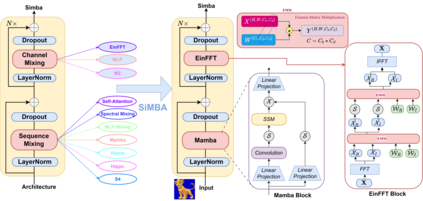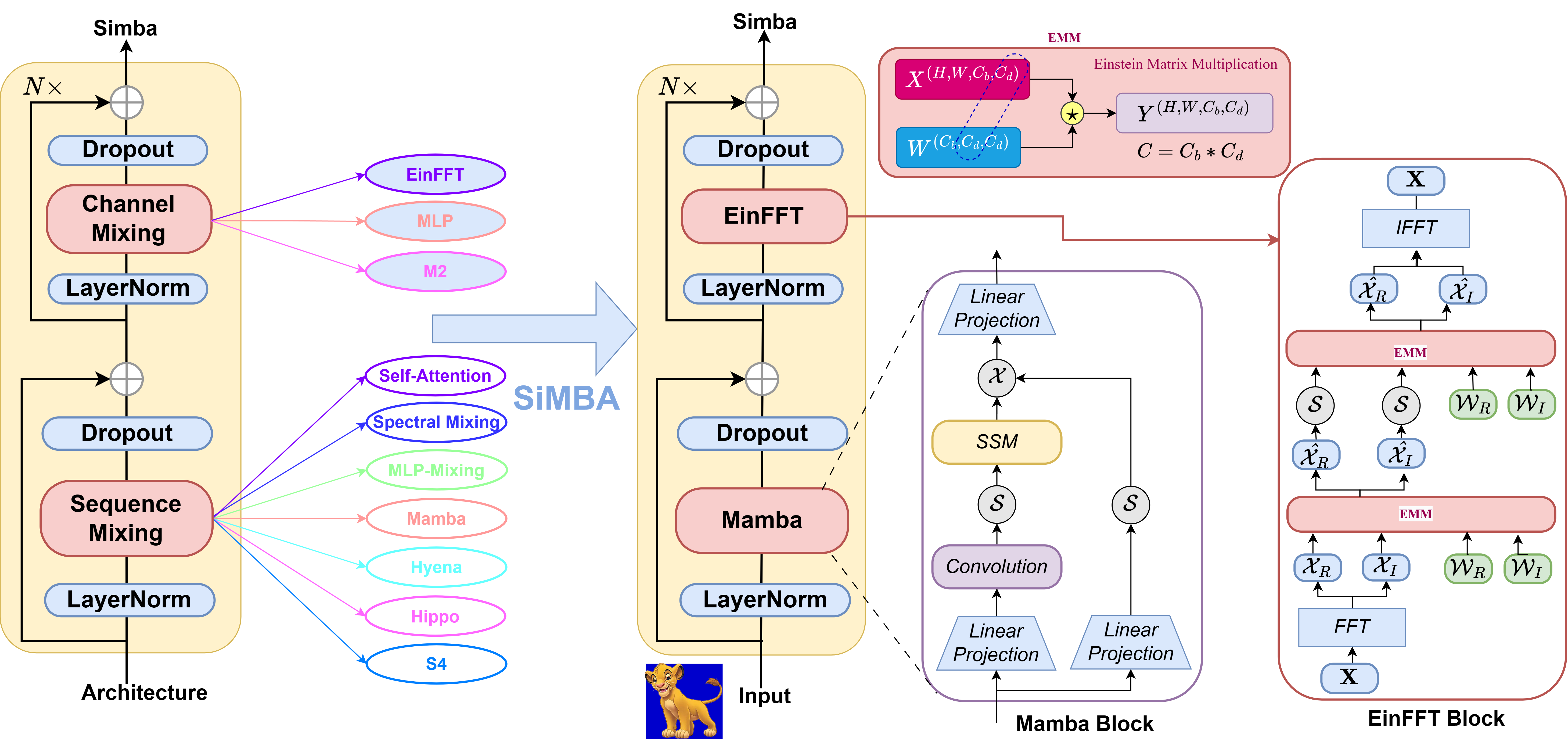 Transformers have widely adopted attention networks for sequence mixing and MLPs for channel mixing, playing a pivotal role in achieving breakthroughs across domains. However, recent literature highlights issues with attention networks, including low inductive bias and quadratic complexity concerning input sequence length. State Space Models (SSMs) like S4 and others (Hippo, Global Convolutions, liquid S4, LRU, Mega, and Mamba), have emerged to address the above issues to help handle longer sequence lengths. Mamba, while being the state-of-the-art SSM, has a stability issue when scaled to large networks for computer vision datasets. We propose SiMBA, a new architecture that introduces Einstein FFT (EinFFT) for channel modeling by specific eigenvalue computations and uses the Mamba block for sequence modeling. Extensive performance studies across image and time-series benchmarks demonstrate that SiMBA outperforms existing SSMs, bridging the performance gap with state-of-the-art transformers. Notably, SiMBA establishes itself as the new state-of-the-art SSM on ImageNet and transfer learning benchmarks such as Stanford Car and Flower as well as task learning benchmarks as well as seven time series benchmark datasets. The project page is available on this website ~\url{https://github.com/badripatro/Simba}.