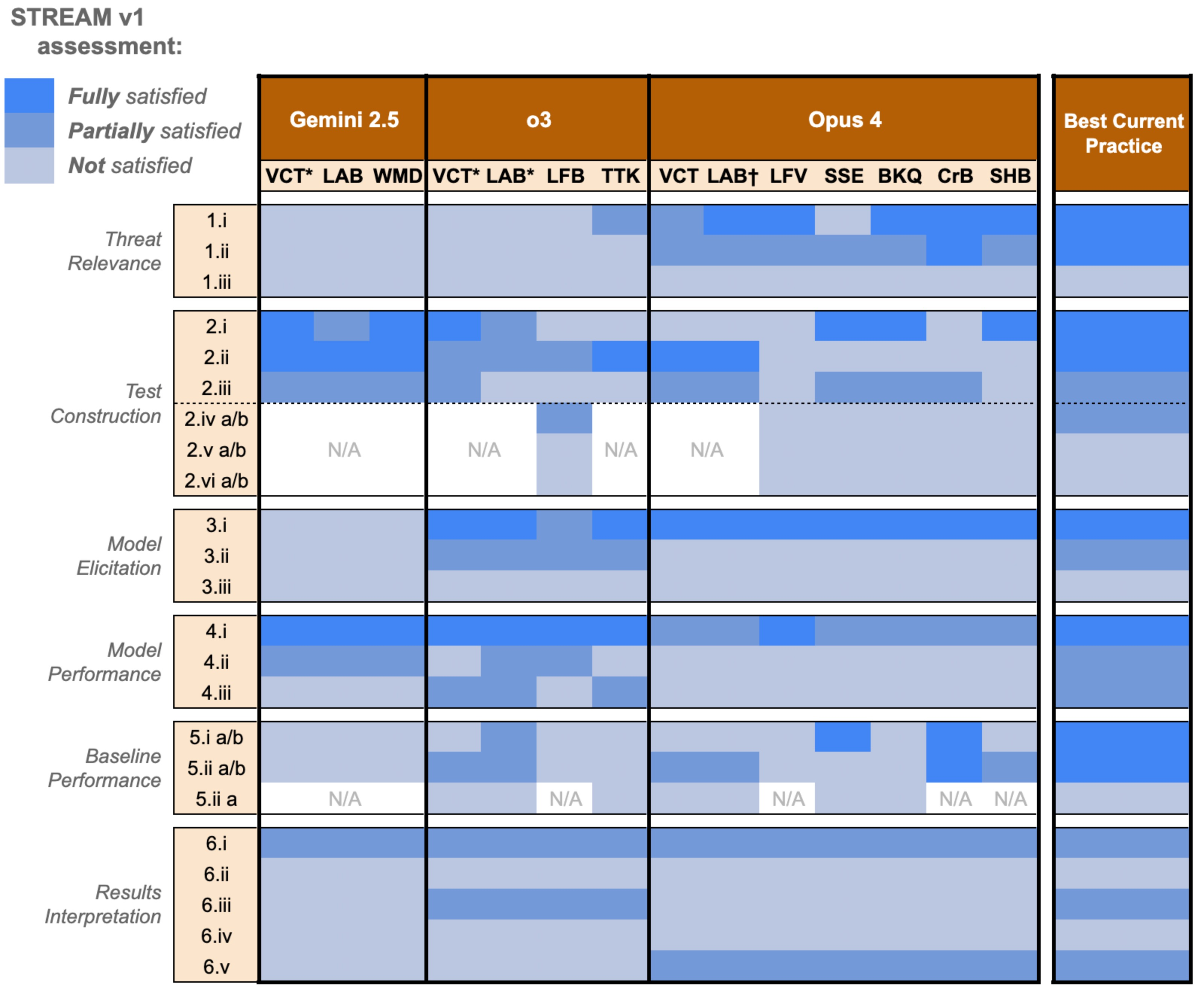 Most frontier AI developers publicly document their safety evaluations of new AI models in model reports, including testing for chemical and biological (ChemBio) misuse risks. This practice provides a window into the methodology of these evaluations, helping to build public trust in AI systems, and enabling third party review in the still-emerging science of AI evaluation. But what aspects of evaluation methodology do developers currently include -- or omit -- in their reports? This paper examines three frontier AI model reports published in spring 2025 with among the most detailed documentation: OpenAI's o3, Anthropic's Claude 4, and Google DeepMind's Gemini 2.5 Pro. We compare these using the STREAM (v1) standard for reporting ChemBio benchmark evaluations. Each model report included some useful details that the others did not, and all model reports were found to have areas for development, suggesting that developers could benefit from adopting one another's best reporting practices. We identified several items where reporting was less well-developed across all model reports, such as providing examples of test material, and including a detailed list of elicitation conditions. Overall, we recommend that AI developers continue to strengthen the emerging science of evaluation by working towards greater transparency in areas where reporting currently remains limited.