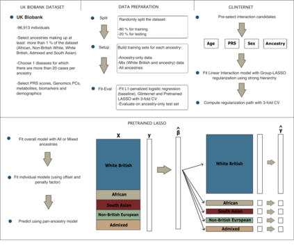 Recent genome-wide association studies (GWAS) have uncovered the genetic basis of complex traits, but show an under-representation of non-European descent individuals, underscoring a critical gap in genetic research. Here, we assess whether we can improve disease prediction across diverse ancestries using multiomic data. We evaluate the performance of Group-LASSO INTERaction-NET (glinternet) and pretrained lasso in disease prediction focusing on diverse ancestries in the UK Biobank. Models were trained on data from White British and other ancestries and validated across a cohort of over 96,000 individuals for 8 diseases. Out of 96 models trained, we report 16 with statistically significant incremental predictive performance in terms of ROC-AUC scores (p-value < 0.05), found for diabetes, arthritis, gall stones, cystitis, asthma and osteoarthritis. For the interaction and pretrained models that outperformed the baseline, the PRS score was the primary driver behind prediction. Our findings indicate that both interaction terms and pre-training can enhance prediction accuracy but for a limited set of diseases and moderate improvements in accuracy