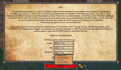 The rapid development of technology has introduced new formats of human-computer interaction, which have in turn produced many new forms of media and a whole new field of interactive multimedia. One of the major mediums that has grown in popularity since its early development is video games. For a long time, video games have been developed and distributed for the purpose of entertainment, however, in the late 2010s, researchers have taken an interest in the characteristics of games and how they can be used for different purposes. Video games allow a tight loop of action-reaction which provides fertile ground for many types of experiments which would be impossible or prohibitively difficult to perform in the physical world, and as such serve as strong virtual alternatives. A video game that is able to produce an immersive experience for the player in which the player believes that they are "actually there" in the game, and that the game is an extension of reality provides an alternate way to explore human behaviors and decision-making processes. Prospect theory questionnaires explore decision-making in hypothetical situations. In most cases, these experiments are done in controlled environments and rely on the respondent's imagination to reproduce the situation which is presented to them. Creating a virtual world with which the players can directly interact with and face tangible consequences of their decisions brings the hypothetical situations of the prospect theory questions closer to the respondent. If the players can interact with and manipulate the virtual world, then it is much easier for them to empathize with it and their character, and thus, the assumption is that the answers represent a more realistic image of the player's decision making.