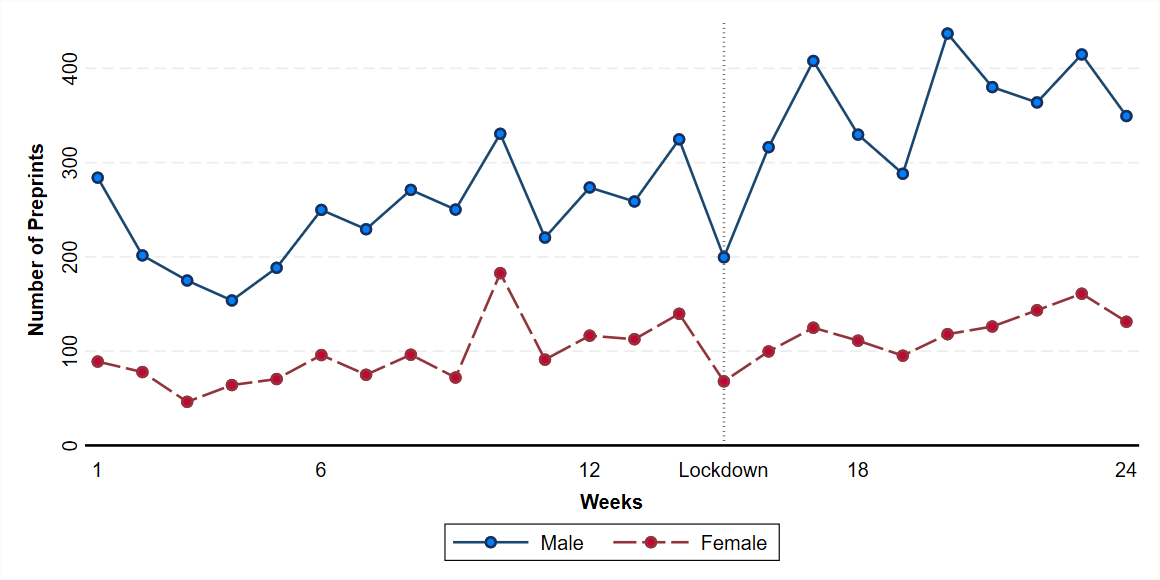 翻译:我们研究了COVID-19爆发对女性和男性学者社会科学研究生产率的过度封闭影响。封锁极大地扰乱了学术活动,要求人们在家里工作。这种中断如何影响生产力和相关性别平等,是一个重要的操作和社会问题。我们从社会科学最大的开放预印库收集了41 858份社会科学预印文件,其中涉及41 858份研究预印件,由25个国家的76 832名作者在两年内制作的18个学科。我们使用差异差异办法利用外来大流行病冲击。我们的结果显示,在美国被封锁后的10个星期里,尽管总体研究生产率提高了35%,但女性学者的生产率比男性学者的生产率下降了13.9%。我们还表明,若干学科导致了这种性别不平等。最后,我们发现,这种强化的生产力差距对于顶级大学的学者来说更为明显,在其他6个国家也存在这种影响。我们的工作指出,由于关闭而导致的生产率的公平问题。我们发现,大学在评估远程生产力时会发现,在评估学院生产率方面会产生意外后果时会有所帮助。