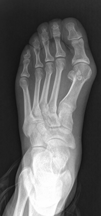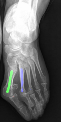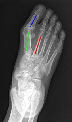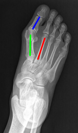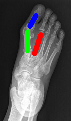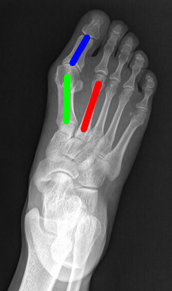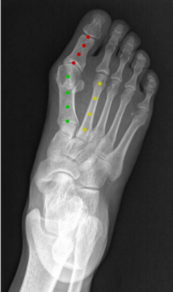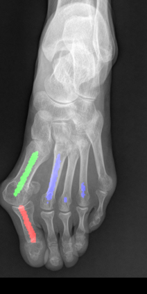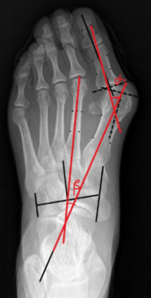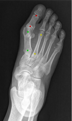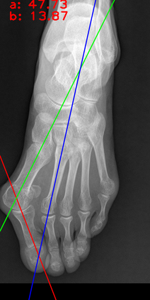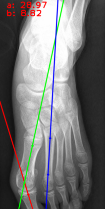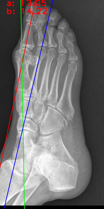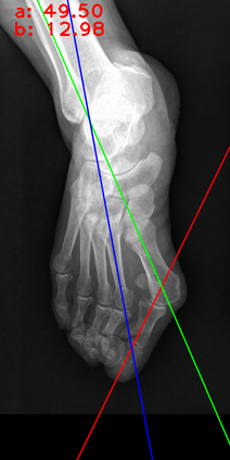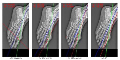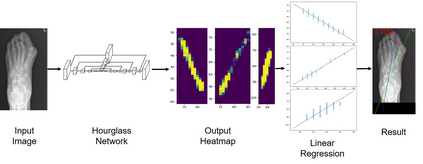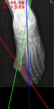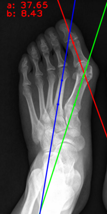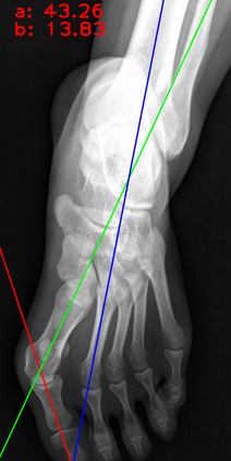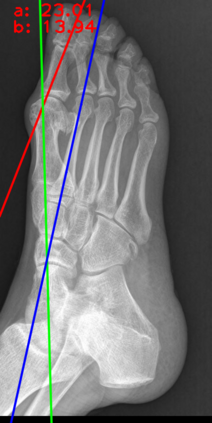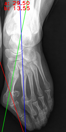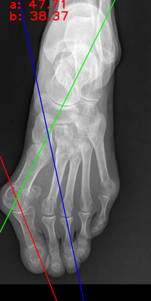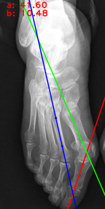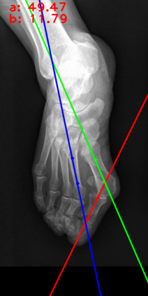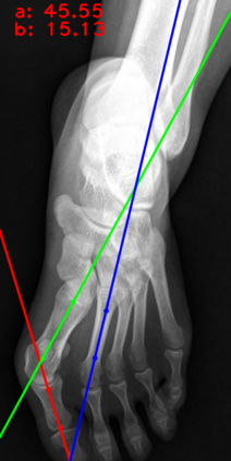 Angular measurements is essential to make a resonable treatment for Hallux valgus (HV), a common forefoot deformity. However, it still depends on manual labeling and measurement, which is time-consuming and sometimes unreliable. Automating this process is a thing of concern. However, it lack of dataset and the keypoints based method which made a great success in pose estimation is not suitable for this field.To solve the problems, we made a dataset and developed an algorithm based on deep learning and linear regression. It shows great fitting ability to the ground truth.