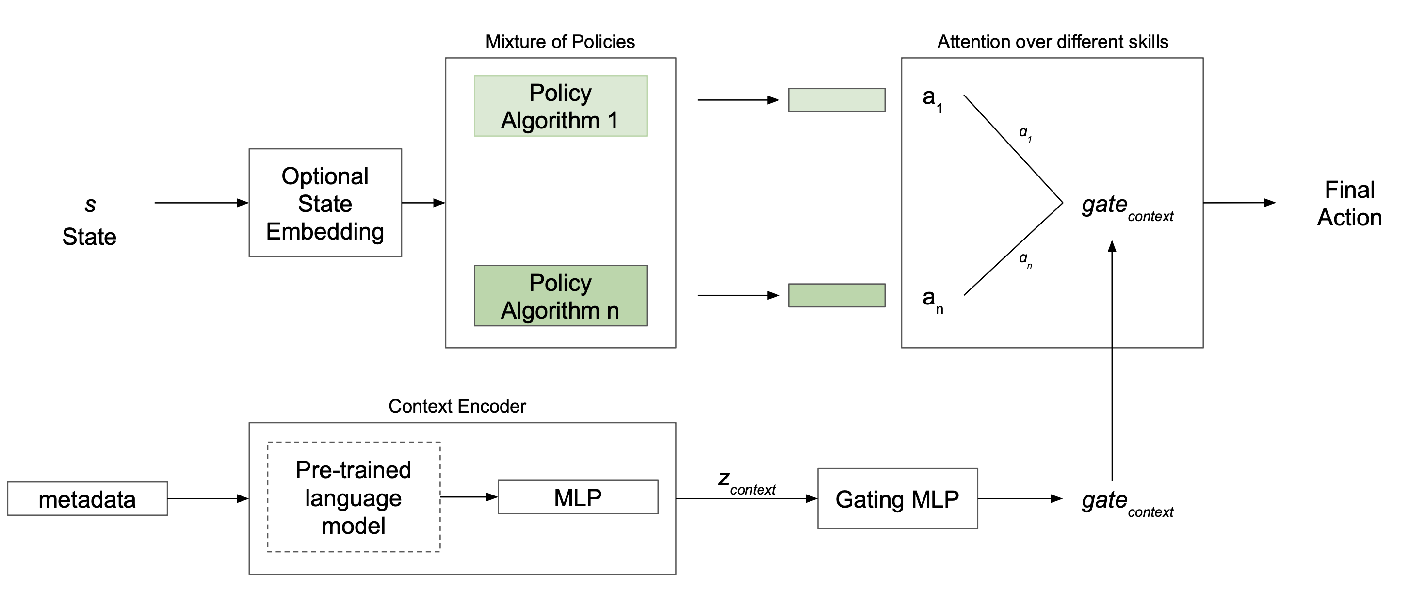 Multi-task reinforcement learning often relies on task metadata -- such as brief natural-language descriptions -- to guide behavior across diverse objectives. We present Lexical Policy Networks (LEXPOL), a language-conditioned mixture-of-policies architecture for multi-task RL. LEXPOL encodes task metadata with a text encoder and uses a learned gating module to select or blend among multiple sub-policies, enabling end-to-end training across tasks. On MetaWorld benchmarks, LEXPOL matches or exceeds strong multi-task baselines in success rate and sample efficiency, without task-specific retraining. To analyze the mechanism, we further study settings with fixed expert policies obtained independently of the gate and show that the learned language gate composes these experts to produce behaviors appropriate to novel task descriptions and unseen task combinations. These results indicate that natural-language metadata can effectively index and recombine reusable skills within a single policy.