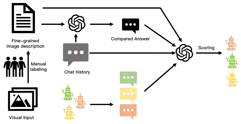 Large vision-language models (LVLMs) have recently witnessed rapid advancements, exhibiting a remarkable capacity for perceiving, understanding, and processing visual information by connecting visual receptor with large language models (LLMs). However, current assessments mainly focus on recognizing and reasoning abilities, lacking direct evaluation of conversational skills and neglecting visual storytelling abilities. In this paper, we propose an evaluation method that uses strong LLMs as judges to comprehensively evaluate the various abilities of LVLMs. Firstly, we construct a comprehensive visual dialogue dataset TouchStone, consisting of open-world images and questions, covering five major categories of abilities and 27 subtasks. This dataset not only covers fundamental recognition and comprehension but also extends to literary creation. Secondly, by integrating detailed image annotations we effectively transform the multimodal input content into a form understandable by LLMs. This enables us to employ advanced LLMs for directly evaluating the quality of the multimodal dialogue without requiring human intervention. Through validation, we demonstrate that powerful LVLMs, such as GPT-4, can effectively score dialogue quality by leveraging their textual capabilities alone, aligning with human preferences. We hope our work can serve as a touchstone for LVLMs' evaluation and pave the way for building stronger LVLMs. The evaluation code is available at https://github.com/OFA-Sys/TouchStone.