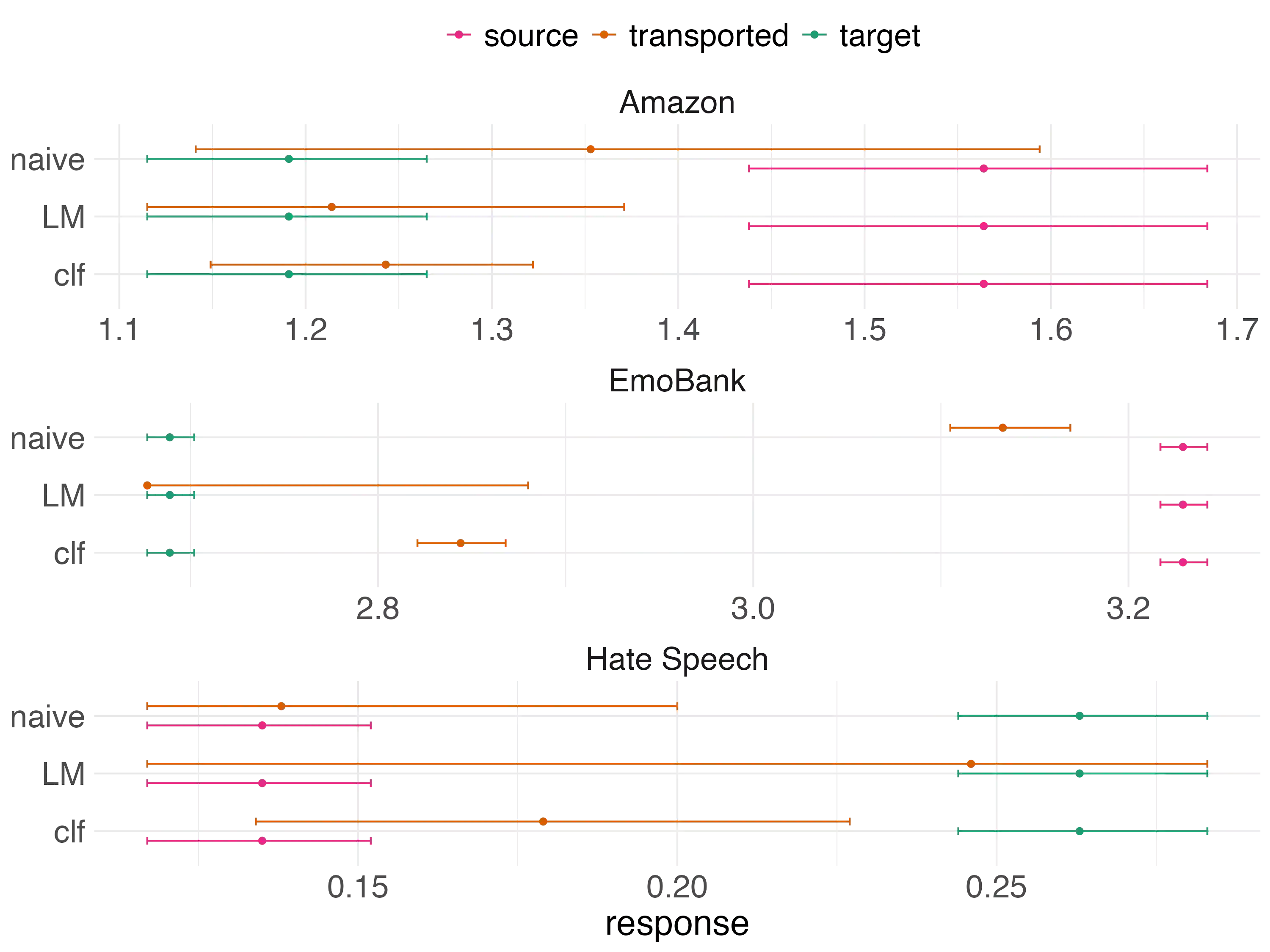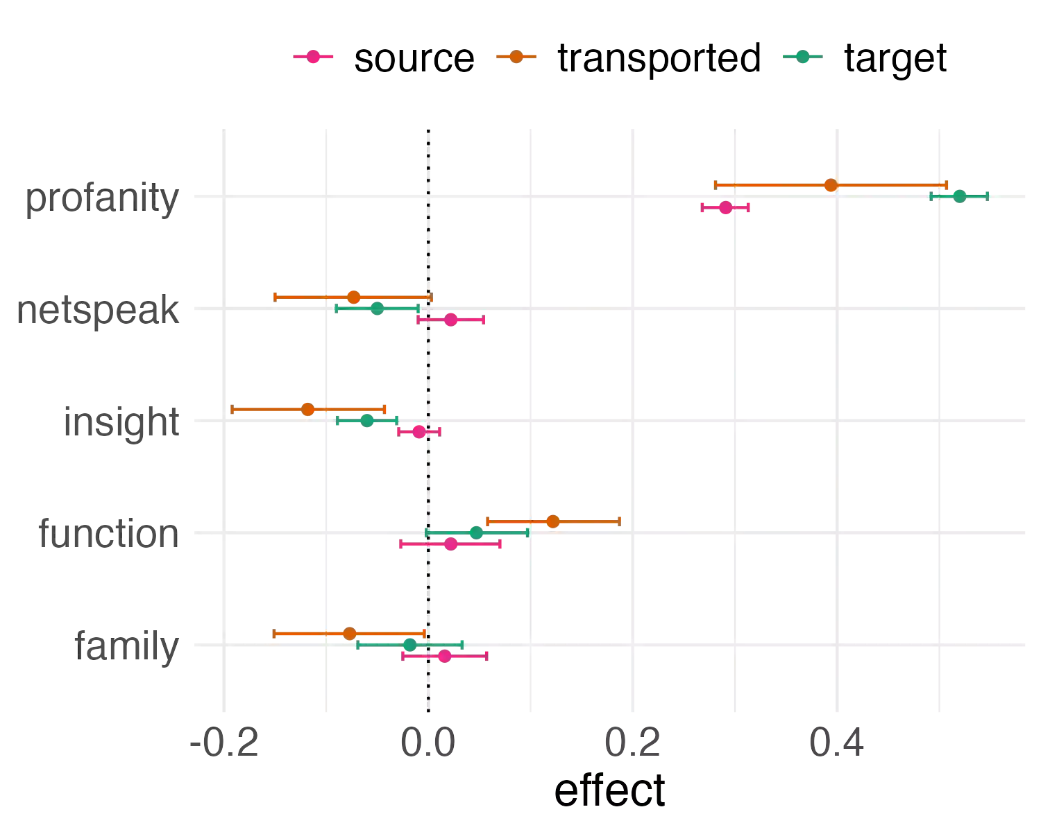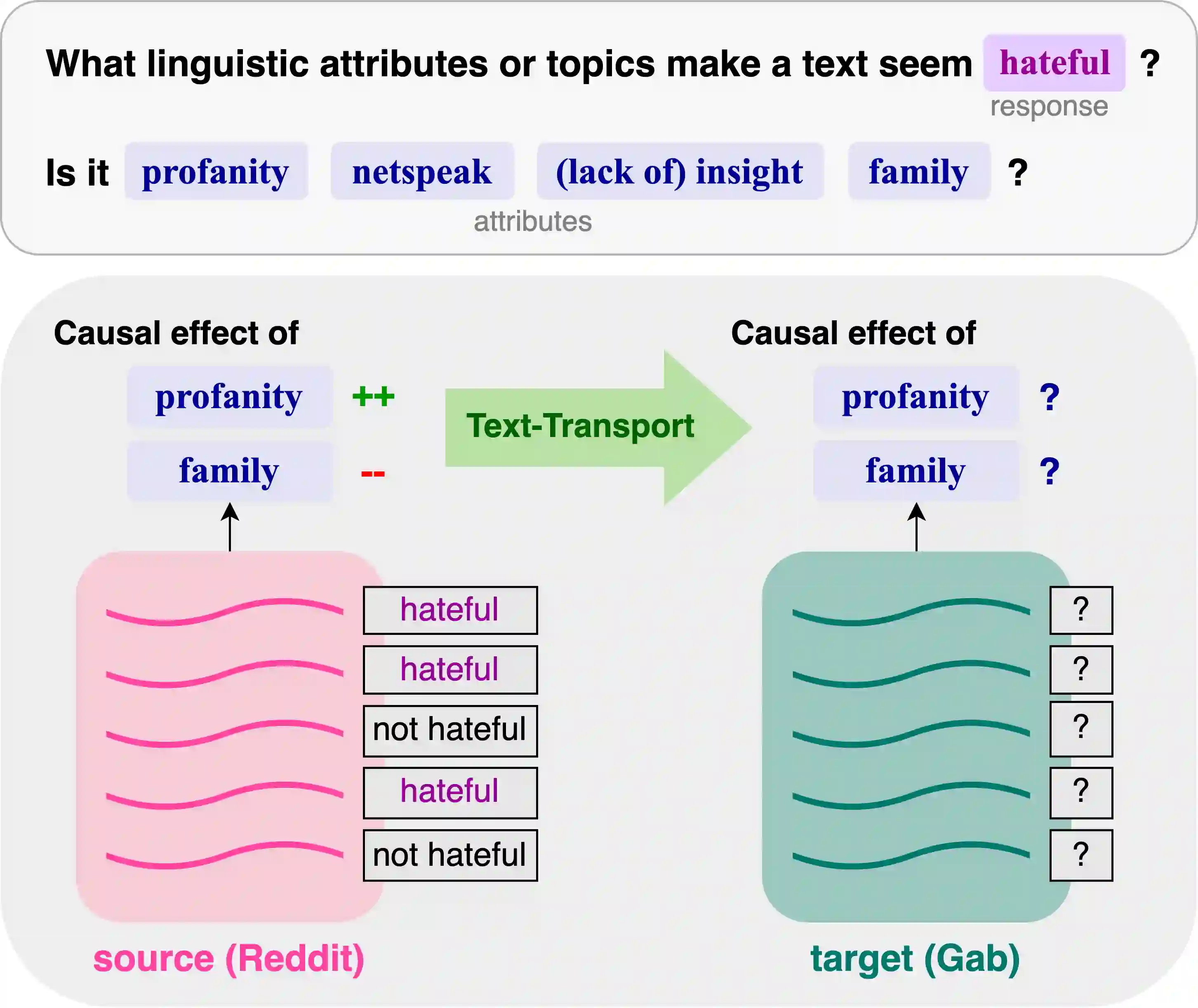 As language technologies gain prominence in real-world settings, it is important to understand how changes to language affect reader perceptions. This can be formalized as the causal effect of varying a linguistic attribute (e.g., sentiment) on a reader's response to the text. In this paper, we introduce Text-Transport, a method for estimation of causal effects from natural language under any text distribution. Current approaches for valid causal effect estimation require strong assumptions about the data, meaning the data from which one can estimate valid causal effects often is not representative of the actual target domain of interest. To address this issue, we leverage the notion of distribution shift to describe an estimator that transports causal effects between domains, bypassing the need for strong assumptions in the target domain. We derive statistical guarantees on the uncertainty of this estimator, and we report empirical results and analyses that support the validity of Text-Transport across data settings. Finally, we use Text-Transport to study a realistic setting--hate speech on social media--in which causal effects do shift significantly between text domains, demonstrating the necessity of transport when conducting causal inference on natural language.