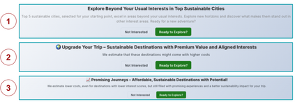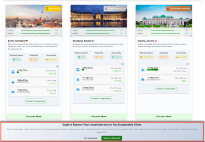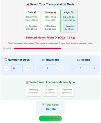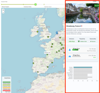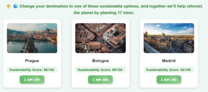 Tourism is a major contributor to global carbon emissions and over-tourism, creating an urgent need for recommender systems that not only inform but also gently steer users toward more sustainable travel decisions. Such choices, however, often require balancing complex trade-offs between environmental impact, cost, convenience, and personal interests. To address this, we present the SmartSustain Recommender, a web application designed to nudge users toward eco-friendlier options through an interactive, user-centric interface. The system visualizes the broader consequences of travel decisions by combining CO2e emissions, destination popularity, and seasonality with personalized interest matching. It employs mechanisms such as interactive city cards for quick comparisons, dynamic banners that surface sustainable alternatives in specific trade-off scenarios, and real-time impact feedback using animated environmental indicators. A preliminary user study with 21 participants indicated strong usability and perceived effectiveness. The system is accessible at https://smartsustainrecommender.web.app.