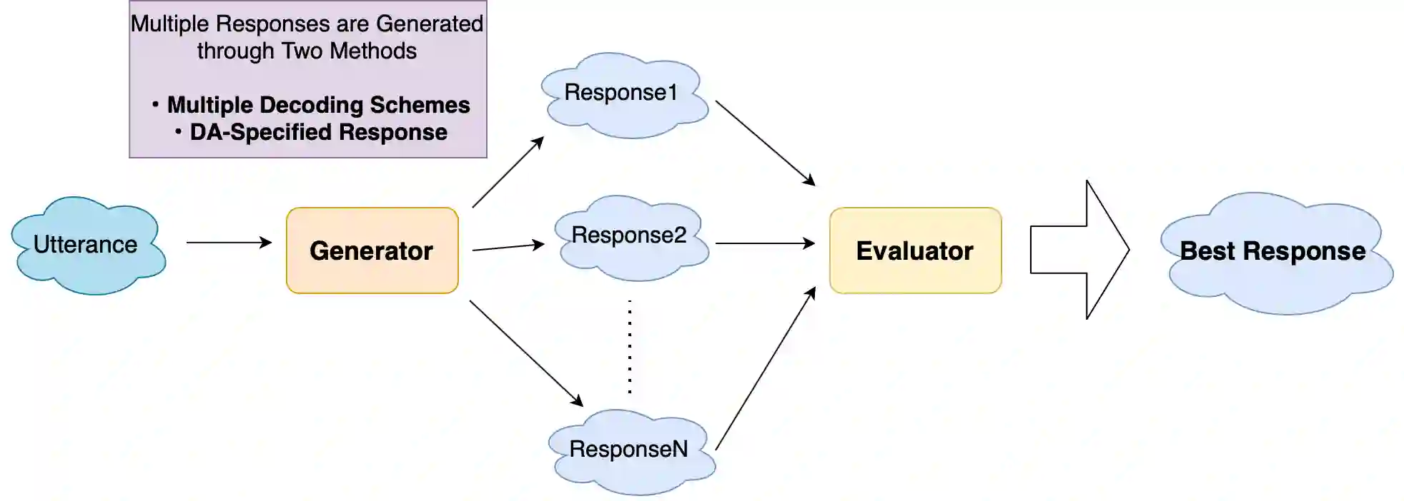 We aim to overcome the lack of diversity in responses of current dialogue systems and to develop a dialogue system that is engaging as a conversational partner. We propose a generator-evaluator model that evaluates multiple responses generated by a response generator and selects the best response by an evaluator. By generating multiple responses, we obtain diverse responses. We conduct human evaluations to compare the output of the proposed system with that of a baseline system. The results of the human evaluations showed that the proposed system's responses were often judged to be better than the baseline system's, and indicated the effectiveness of the proposed method.