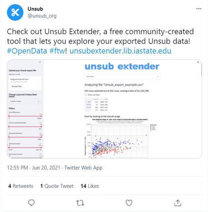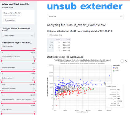 This article introduces Unsub Extender, a free tool to help libraries analyze their Unsub data export files. Unsub is a collection development dashboard that gathers and forecasts journal-level usage metrics to provide academic libraries with deeper measurements than traditional cost-per-use. Unsub gives libraries richer and more nuanced data to analyze their subscriptions, but it does not include a way to easily visualize the complex and interrelated data points it provides. Unsub Extender (https://unsubextender.lib.iastate.edu) is a free Python-based web application that takes an Unsub export file and automates the creation of interactive plots and visualizations. The tool loads with example data to explore, and users upload their specific Unsub file to quickly populate the pre-made plots with actual data. Graphs are interactive, live-updating, and support zoom, click-and-drag, and hover. Filters are specified through sliders to model scenarios and focus on areas of interest. A drop-down menu allows users to change a journal's decision status, and graphs update automatically. After evaluating journals, users can export the modified dataset to save their decisions. Unsub Extender proposes best practice in analyzing the increasingly common Unsub export file. It simplifies the analysis, eliminates duplication of effort, and enables libraries worldwide to make better, more data-driven decisions.