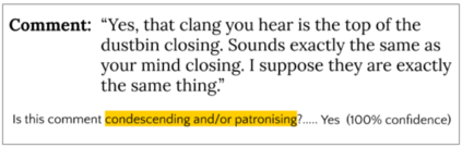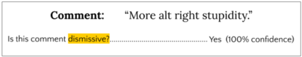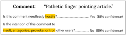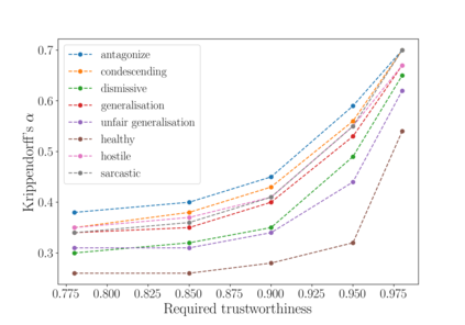 翻译:我们提出了一个由人群工人标注的大约44,000条评论组成的新数据集。 每条评论都标为“健康”或“不健康 ”, 除了六种潜在“不健康”子属性的二进制标签:(1) 敌对;(2) 敌对、侮辱、挑衅或牵引;(3) 鄙视;(4) 任人唯亲或赞助;(5) 讽刺;和/或(6) 不公平的概括。 每条标签都有相关的信任分。 我们认为,需要数据集,使基于“不健康在线对话”的广泛概念的研究成为可能。 我们构建了这种分类,以包括大量有助于不健康在线对话的个人评论。 对于其中一些属性,这是这一规模的第一个可公开获取的数据集。 我们探索数据集的质量, 提供一些简要统计数据和初步模型来说明这些数据的效用, 并强调进一步研究的局限性和方向。