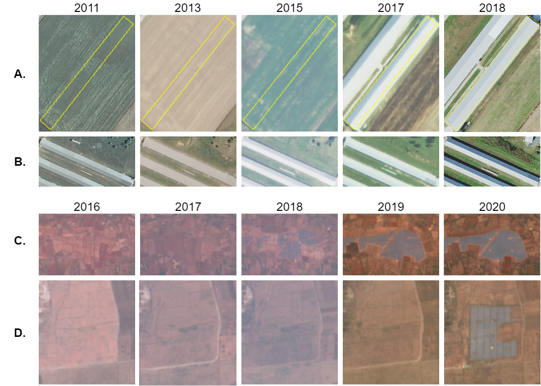 翻译:纵向研究对于理解地球的动态变化至关重要, 但标签( 如建筑物、 设施、 道路等) 往往只为单一时间点提供。 我们提议了一个通用模型, 即时群群比匹配( TCM), 用于在仅观察一次足迹标签时探测遥感图像时间序列中的建筑变化。 模型背后的直觉是建筑物内外光谱值之间的关系在建筑物建造( 或拆除) 时会发生变化。 例如, 在农村环境中, 开工前地区可能看起来与周围环境相似, 直到建筑物建成。 同样, 在城市环境中, 开工前地区将看起来与周围环境不同, 直到建筑完成。 我们进一步提议采用一个超常模型, 用于在新环境中应用模型参数。 我们用模型模型模型在2016 - 2016 - 17 高分辨率的家禽谷仓库上应用我们的模型, 以及太阳能农场的数据集, 从2020 mosaisac labil 2 模型的深度检测到印度Sentinal II 的多重图像模型, 类似, 开工前地区将看起来与周围环境环境环境环境不同。 我们的建筑 的模型的模型显示我们所监督的精细化 的模型, 我们的模型 的模型的模型的模型 运行 显示我们所有模型 的模型 的模型的模型 运行 运行的模型 运行的模型 运行的模型 显示的模型的模型 的模型 的模型 的模型 的模型 运行 运行 运行 运行