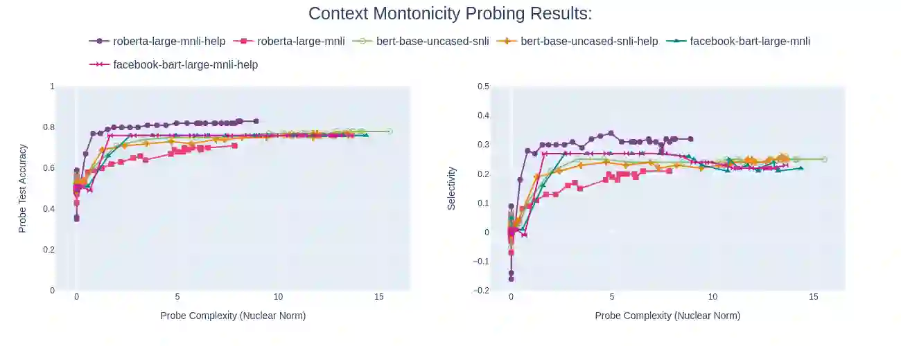 翻译:为了解释神经NLI模型及其推理战略,我们开展了一项系统的测试研究,调查这些模型是否反映了自然逻辑的关键语义特征:单音和概念包容。正确确定向下摩诺因环境中的有效推论是NLI性能的一个已知绊脚石,将否定范围和通用量化指标等语言现象归并起来。为了理解这一困难,我们强调单一性是背景的属性,并审查这些模型在背景嵌入中采集单音信息的程度,而这种嵌入是其决策过程的中间部分。我们借鉴最近推进的Probent范式,比较各种模型中存在的单音特征。我们发现,在流行的NLI模型的表述中,单音信息明显薄弱,这些模型在基准上得分很高。我们注意到,以前根据微调战略对这些模型的改进带来了更强的单调特征,同时提高了其在挑战组合上的性能。