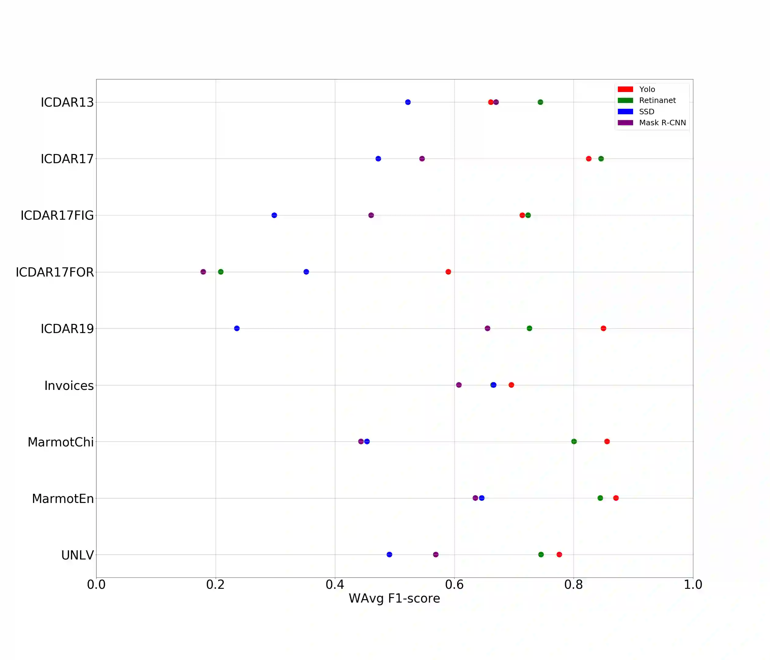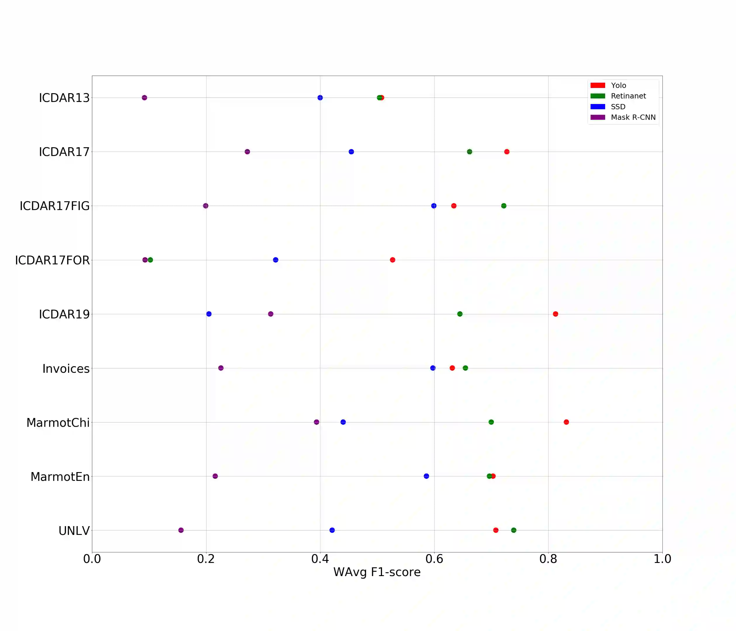 翻译:文档中的表格正确定位有助于确定其结构和提取内容; 因此, 表格检测是表格理解中的一个关键步骤。 如今, 文档图像中最成功的表格检测方法采用深层次学习算法; 特别是称为微调的技术。 在这方面, 这种技术输出在自然图像中探测天体以探测文件图像表格的知识。 然而, 自然图像和文件图像之间只有模糊的关系, 微调在源和目标任务之间有密切关系时效果更好。 在本文中, 我们表明从更近的域进行微调更有益。 为此, 我们培训不同的对象检测算法( 即, Mask R- CNN、 RetinanNet、 SSD 和 YOLO), 使用表班克数据集( 用于表格检测和识别的学术文件的数据集), 并微调这些图案用于若干混杂的表格检测数据集。 使用这种方法, 我们大大提高了从自然图像中微调的探测模型的准确性( 意为17%, 最佳情况下为60 % ) 。