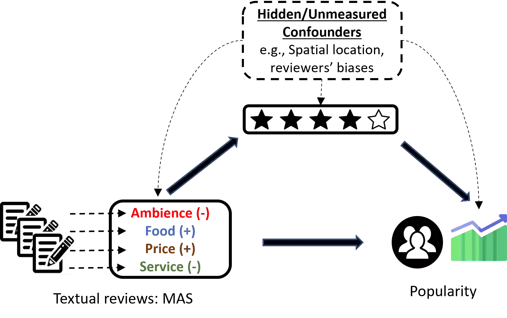 翻译:在线审查体系是许多企业寻求建立品牌和传播其信息的主要手段。先前的研究研究在线审查的效果主要集中于单一数字原因,例如评级或情绪分数。我们争辩说,这种原因概念包含三个关键限制:它们仅仅考虑单一数字原因的影响,忽视文本审查中包含的多种方面 -- -- 例如食品、服务 -- -- 的不同影响;它们假定观察研究中不存在隐藏的混淆者,例如消费者的个人偏好;它们忽视了可能抵消文字审查对商业收入的影响的数字原因的间接影响。因此,我们提出对网上审查的这种单一的、基于原因的影响估计的另一种观点:在隐藏的聚合者面前,我们考虑多层次的文本审查,特别是其对商业收入的总体影响和与数字原因的直接影响 -- -- 评级 -- -- 是调解者。我们借鉴机器学习和因果关系推断的最新进展,共同估计隐藏的聚合者和因果关系效应。我们用现实世界的例子提出实证评价,以讨论区分多种业务影响的重要性和影响。