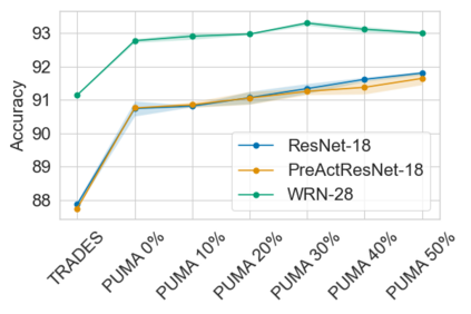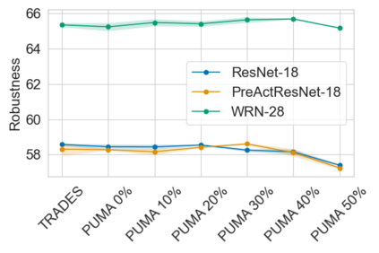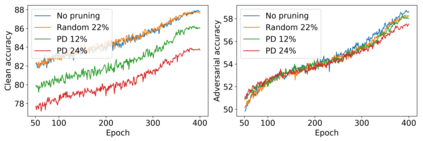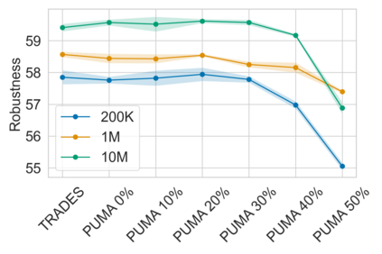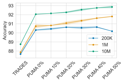 Deep learning has been able to outperform humans in terms of classification accuracy in many tasks. However, to achieve robustness to adversarial perturbations, the best methodologies require to perform adversarial training on a much larger training set that has been typically augmented using generative models (e.g., diffusion models). Our main objective in this work, is to reduce these data requirements while achieving the same or better accuracy-robustness trade-offs. We focus on data pruning, where some training samples are removed based on the distance to the model classification boundary (i.e., margin). We find that the existing approaches that prune samples with low margin fails to increase robustness when we add a lot of synthetic data, and explain this situation with a perceptron learning task. Moreover, we find that pruning high margin samples for better accuracy increases the harmful impact of mislabeled perturbed data in adversarial training, hurting both robustness and accuracy. We thus propose PUMA, a new data pruning strategy that computes the margin using DeepFool, and prunes the training samples of highest margin without hurting performance by jointly adjusting the training attack norm on the samples of lowest margin. We show that PUMA can be used on top of the current state-of-the-art methodology in robustness, and it is able to significantly improve the model performance unlike the existing data pruning strategies. Not only PUMA achieves similar robustness with less data, but it also significantly increases the model accuracy, improving the performance trade-off.