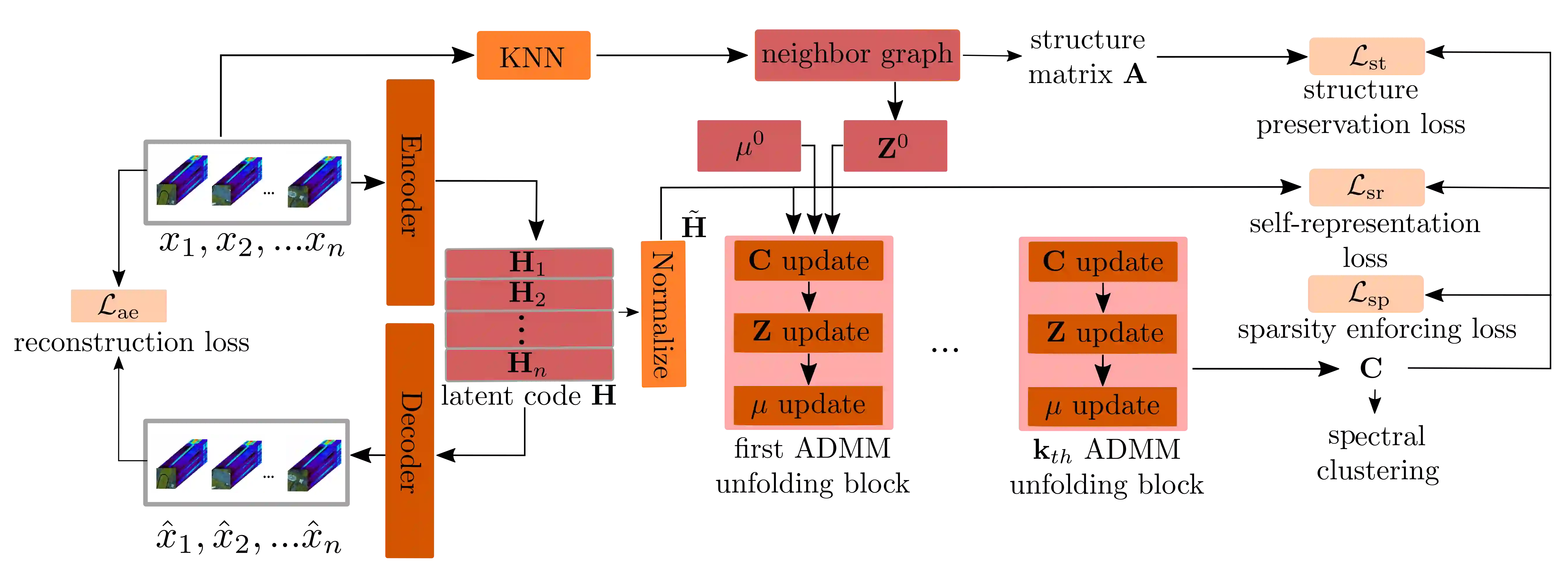 Deep subspace clustering methods are now prominent in clustering, typically using fully connected networks and a self-representation loss function. However, these methods often struggle with overfitting and lack interpretability. In this paper, we explore an alternative clustering approach based on deep unfolding. By unfolding iterative optimization methods into neural networks, this approach offers enhanced interpretability and reliability compared to data-driven deep learning methods, and greater adaptability and generalization than model-based approaches. Hence, unfolding has become widely used in inverse imaging problems, such as image restoration, reconstruction, and super-resolution, but has not been sufficiently explored yet in the context of clustering. In this work, we introduce an innovative clustering architecture for hyperspectral images (HSI) by unfolding an iterative solver based on the Alternating Direction Method of Multipliers (ADMM) for sparse subspace clustering. To our knowledge, this is the first attempt to apply unfolding ADMM for computing the self-representation matrix in subspace clustering. Moreover, our approach captures well the structural characteristics of HSI data by employing the K nearest neighbors algorithm as part of a structure preservation module. Experimental evaluation of three established HSI datasets shows clearly the potential of the unfolding approach in HSI clustering and even demonstrates superior performance compared to state-of-the-art techniques.