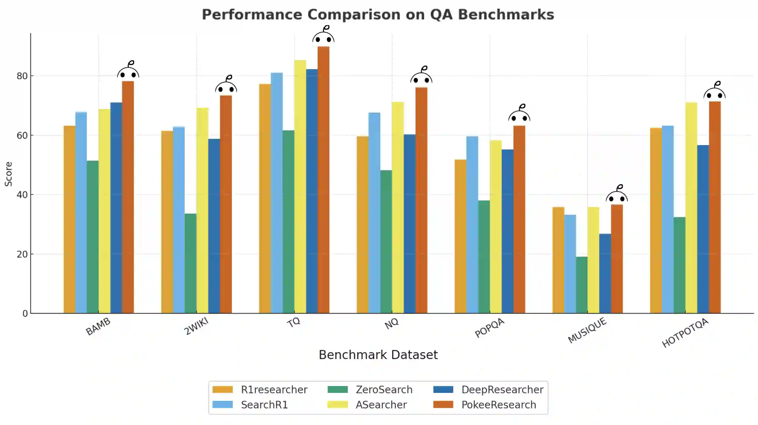 翻译:工具增强型大语言模型(LLM)正逐渐成为深度研究智能体,这类系统能够分解复杂查询、检索外部证据并生成基于事实的响应。然而,当前智能体仍受限于浅层检索、弱对齐指标以及脆弱的工具使用行为。本文提出PokeeResearch-7B——一个基于统一强化学习框架构建的70亿参数深度研究智能体,具备鲁棒性、对齐性和可扩展性。该模型通过免标注的AI反馈强化学习(RLAIF)框架进行训练,利用基于LLM的奖励信号优化策略,这些奖励信号涵盖事实准确性、引用忠实度与指令遵循度。通过思维链驱动的多轮调用推理框架,结合自我验证与工具故障自适应恢复机制,进一步提升了系统的鲁棒性。在10个主流深度研究基准测试中,PokeeResearch-7B在70亿参数规模的深度研究智能体中取得了最先进的性能。这表明精心的强化学习与推理设计能够催生高效、稳健且具备研究级水平的AI智能体。模型及推理代码已基于MIT许可证在https://github.com/Pokee-AI/PokeeResearchOSS开源。