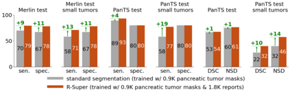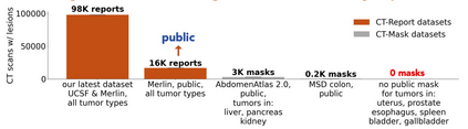Early tumor detection save lives. Each year, more than 300 million computed tomography (CT) scans are performed worldwide, offering a vast opportunity for effective cancer screening. However, detecting small or early-stage tumors on these CT scans remains challenging, even for experts. Artificial intelligence (AI) models can assist by highlighting suspicious regions, but training such models typically requires extensive tumor masks--detailed, voxel-wise outlines of tumors manually drawn by radiologists. Drawing these masks is costly, requiring years of effort and millions of dollars. In contrast, nearly every CT scan in clinical practice is already accompanied by medical reports describing the tumor's size, number, appearance, and sometimes, pathology results--information that is rich, abundant, and often underutilized for AI training. We introduce R-Super, which trains AI to segment tumors that match their descriptions in medical reports. This approach scales AI training with large collections of readily available medical reports, substantially reducing the need for manually drawn tumor masks. When trained on 101,654 reports, AI models achieved performance comparable to those trained on 723 masks. Combining reports and masks further improved sensitivity by +13% and specificity by +8%, surpassing radiologists in detecting five of the seven tumor types. Notably, R-Super enabled segmentation of tumors in the spleen, gallbladder, prostate, bladder, uterus, and esophagus, for which no public masks or AI models previously existed. This study challenges the long-held belief that large-scale, labor-intensive tumor mask creation is indispensable, establishing a scalable and accessible path toward early detection across diverse tumor types. We plan to release our trained models, code, and dataset at https://github.com/MrGiovanni/R-Super