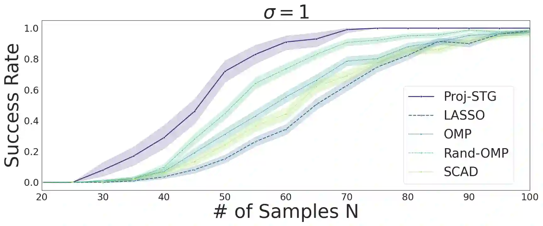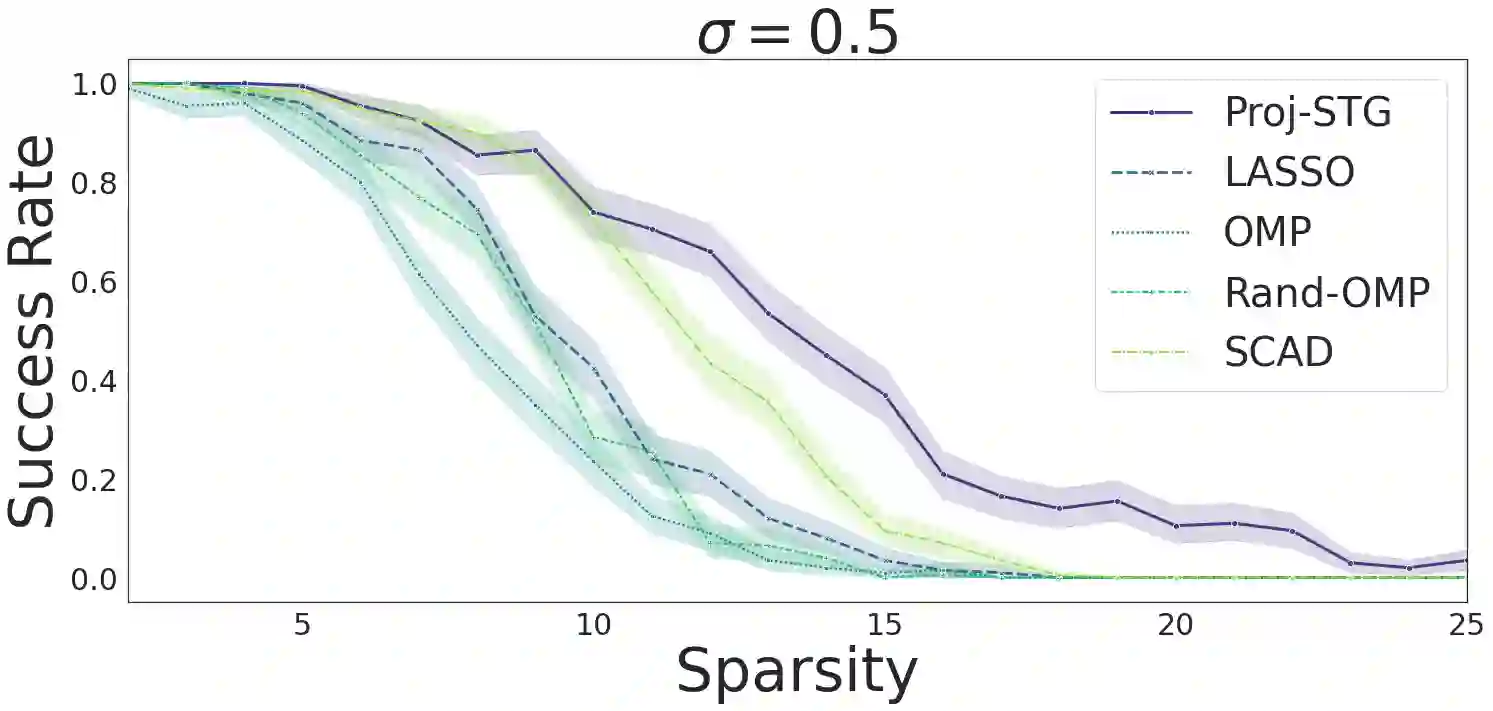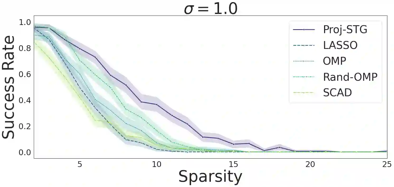 We analyze the problem of simultaneous support recovery and estimation of the coefficient vector ($\beta^*$) in a linear model with independent and identically distributed Normal errors. We apply the penalised least square estimator of $\beta^*$ based on non-linear penalties of stochastic gates (STG) [YLNK20] to estimate the coefficients. Considering Gaussian design matrices we show that under reasonable conditions on dimension and sparsity of $\beta^*$ the STG based estimator converges to the true data generating coefficient vector and also detects its support set with high probability. We propose a new projection based algorithm for the linear models setup to improve upon the existing STG estimator that was originally designed for general non-linear models. Our new procedure outperforms many classical estimators for sparse support recovery in synthetic data analysis.