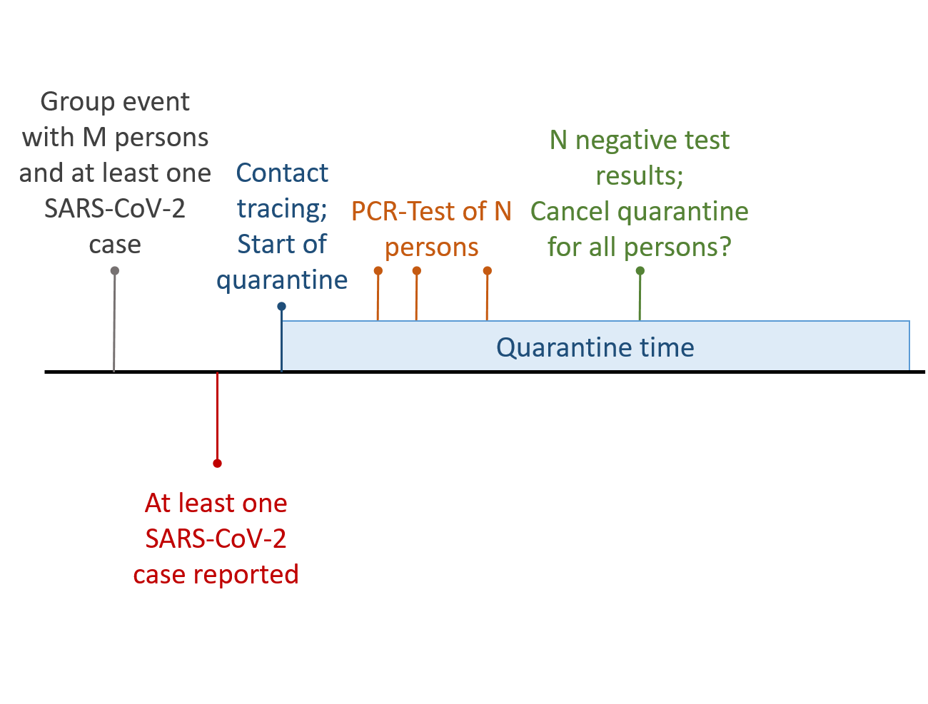 In February 2020 the first human infection with SARS-CoV-2 was reported in Germany. Since then the local public health offices have been responsible to monitor and react to the dynamics of the pandemic. One of their major tasks is to contain the spread of the virus after potential spreading events, for example when one or multiple participants have a positive test result after a group meeting (e.g. at school, at a sports event or at work). In this case, contacts of the infected person have to be traced and potentially are quarantined (at home) for a period of time. When all relevant contact persons obtain a negative polymerase chain reaction (PCR) test result, the quarantine may be stopped. However, tracing and testing of all contacts is time-consuming, costly and (thus) not always feasible. This motivates our work, in which we present a statistical model for the probability that no transmission of Sars-CoV-2 occurred given an arbitrary number of test results at potentially different timepoints. Hereby, the time-dependent sensitivity and specificity of the conducted PCR test are taken in account. We employ a parametric Bayesian model which can be adopted to different situations when specific prior knowledge is available. This is illustrated for group events in German school classes and applied to exemplary real-world data from this context. Our approach has the potential to support important quarantine decisions with the goal to achieve a better balance between necessary containment of the pandemic and preservation of social and economic life. The focus of future work should be on further refinement and evaluation of quarantine decisions based on our statistical model.