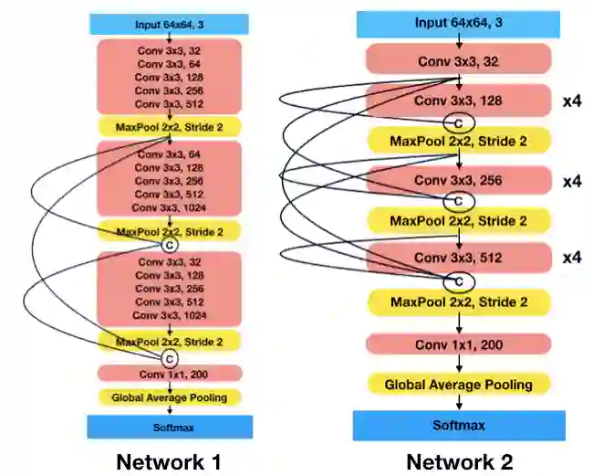 In this paper, we present two image classification models on the Tiny ImageNet dataset. We built two very different networks from scratch based on the idea of Densely Connected Convolution Networks. The architecture of the networks is designed based on the image resolution of this specific dataset and by calculating the Receptive Field of the convolution layers. We also used some non-conventional techniques related to image augmentation and Cyclical Learning Rate to improve the accuracy of our models. The networks are trained under high constraints and low computation resources. We aimed to achieve top-1 validation accuracy of 60%; the results and error analysis are also presented.