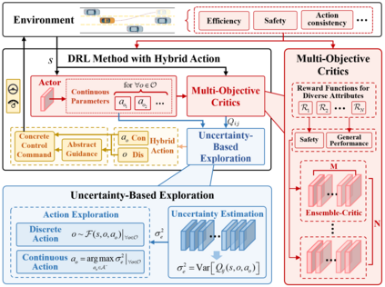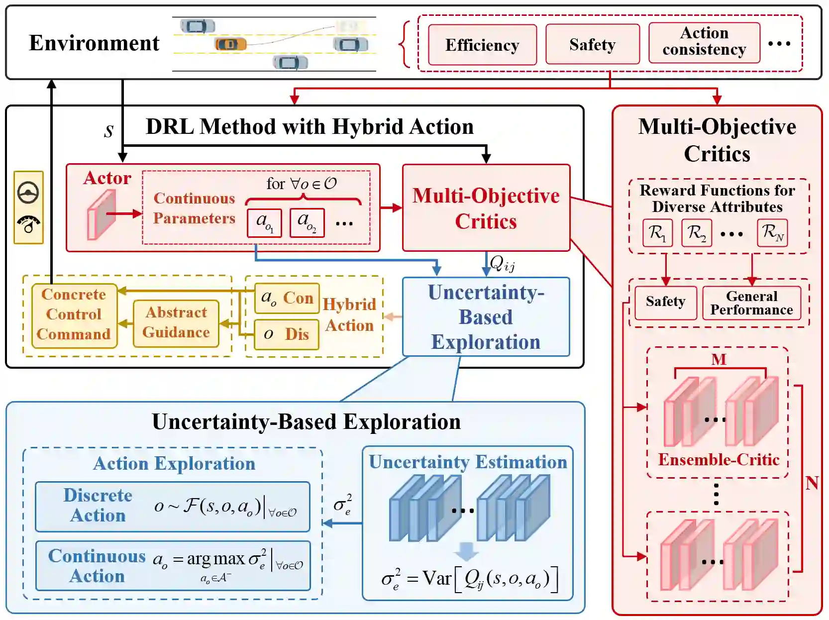Reinforcement Learning (RL) has shown excellent performance in solving decision-making and control problems of autonomous driving, which is increasingly applied in diverse driving scenarios. However, driving is a multi-attribute problem, leading to challenges in achieving multi-objective compatibility for current RL methods, especially in both policy execution and policy iteration. On the one hand, the common action space structure with single action type limits driving flexibility or results in large behavior fluctuations during policy execution. On the other hand, the multi-attribute weighted single reward function result in the agent's disproportionate attention to certain objectives during policy iterations. To this end, we propose a Multi-objective Ensemble-Critic reinforcement learning method with Hybrid Parametrized Action for multi-objective compatible autonomous driving. Specifically, a parameterized action space is constructed to generate hybrid driving actions, combining both abstract guidance and concrete control commands. A multi-objective critics architecture is constructed considering multiple attribute rewards, to ensure simultaneously focusing on different driving objectives. Additionally, uncertainty-based exploration strategy is introduced to help the agent faster approach viable driving policy. The experimental results in both the simulated traffic environment and the HighD dataset demonstrate that our method can achieve multi-objective compatible autonomous driving in terms of driving efficiency, action consistency, and safety. It enhances the general performance of the driving while significantly increasing training efficiency.