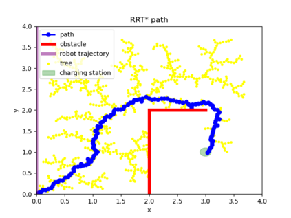 Mobile robots often have limited battery life and need to recharge periodically. This paper presents an RRT- based path-planning algorithm that addresses battery power management. A path is generated continuously from the robot's current position to its recharging station. The robot decides if a recharge is needed based on the energy required to travel on that path and the robot's current power. RRT* is used to generate the first path, and then subsequent paths are made using information from previous trees. Finally, the presented algorithm was compared with Extended Rate Random Tree (ERRT) algorithm