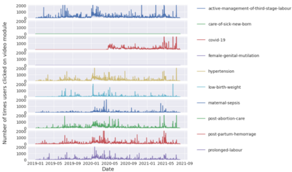 Maternal and child mortality is a public health problem that disproportionately affects low- and middle-income countries. Every day, 800 women and 6,700 newborns die from complications related to pregnancy or childbirth. And for every maternal death, about 20 women suffer serious birth injuries. However, nearly all of these deaths and negative health outcomes are preventable. Midwives are key to revert this situation, and thus it is essential to strengthen their capacities and the quality of their education. This is the aim of the Safe Delivery App, a digital job aid and learning tool to enhance the knowledge, confidence and skills of health practitioners. Here, we use the behavioral logs of the App to implement a recommendation system that presents each midwife with suitable contents to continue gaining expertise. We focus on predicting the click-through rate, the probability that a given user will click on a recommended content. We evaluate four deep learning models and show that all of them produce highly accurate predictions.