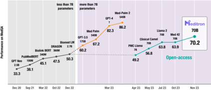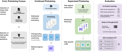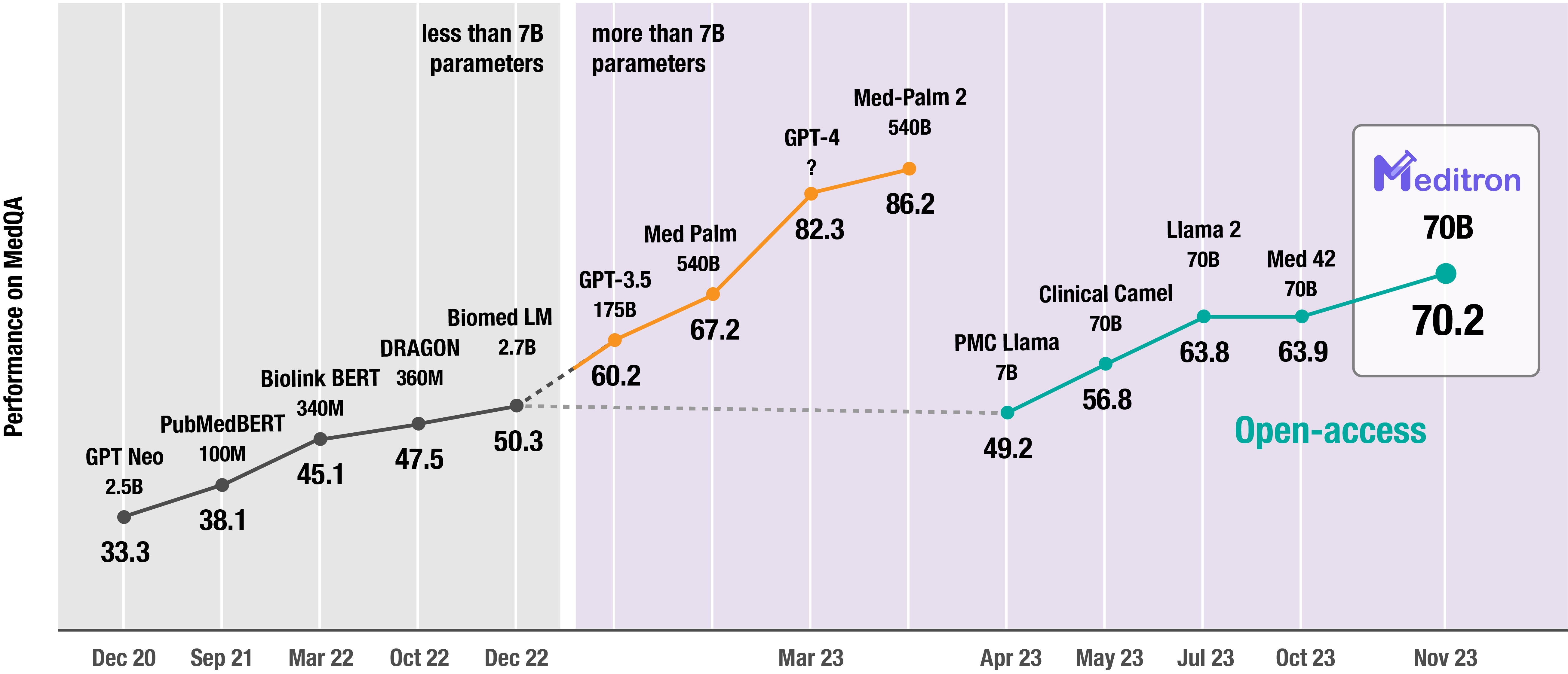 Large language models (LLMs) can potentially democratize access to medical knowledge. While many efforts have been made to harness and improve LLMs' medical knowledge and reasoning capacities, the resulting models are either closed-source (e.g., PaLM, GPT-4) or limited in scale (<= 13B parameters), which restricts their abilities. In this work, we improve access to large-scale medical LLMs by releasing MEDITRON: a suite of open-source LLMs with 7B and 70B parameters adapted to the medical domain. MEDITRON builds on Llama-2 (through our adaptation of Nvidia's Megatron-LM distributed trainer), and extends pretraining on a comprehensively curated medical corpus, including selected PubMed articles, abstracts, and internationally-recognized medical guidelines. Evaluations using four major medical benchmarks show significant performance gains over several state-of-the-art baselines before and after task-specific finetuning. Overall, MEDITRON achieves a 6% absolute performance gain over the best public baseline in its parameter class and 3% over the strongest baseline we finetuned from Llama-2. Compared to closed-source LLMs, MEDITRON-70B outperforms GPT-3.5 and Med-PaLM and is within 5% of GPT-4 and 10% of Med-PaLM-2. We release our code for curating the medical pretraining corpus and the MEDITRON model weights to drive open-source development of more capable medical LLMs.