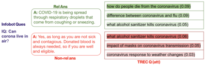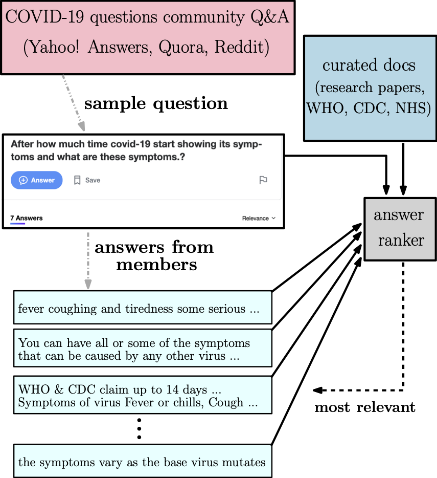 翻译:社区问题解答和讨论平台,如Reddit、Yahoo!答案或Quora等,为用户提供了向广大受众提出开放式问题的灵活度,对这些问题的答复对用户和社区在卫生、体育或金融等某些专题上的答案都可能有用。鉴于最近围绕COVID-19的事件,其中一些平台吸引了用户对与该疾病有关的若干方面的2000+问题。鉴于这一疾病对公众的影响,我们在这项工作中调查了如何改进用户对COVID-19的答复的排序。我们特别探讨了外部附带信息技术来源(如CDC准则或WHO FAQs)在改进这类平台的答案排名方面的效用。我们发现,根据问答的相似性排列用户答案是不够的,现有模型无法有效地利用外部(侧面)信息。在这项工作中,我们展示了基于神经模型的不同关注的有效性,这些模型可以直接利用技术文件或经核实的论坛(例如COVID-19或WHO网站的研究出版物)中可获得的侧面信息。我们用温度机制强化了外部技术来源(如CDC准则或WHO FAQs)的注意度,而基于神经模型可以有选择地决定侧信息在用户答案排名上的相关性。