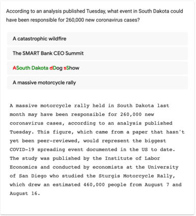 翻译:大部分美国成年人至少从互联网上获得一些新闻。 尽管许多在线新闻产品的目标是让用户了解这些新闻,但他们缺乏可扩缩和可靠的工具来衡量他们实现该目标的程度,因此不得不使用噪音代理量(例如点击通速率或阅读时间)来跟踪他们的表现。作为衡量大规模新闻知情程度的第一步,我们研究了测试式多选择问题生成问题,这可以用来调查用户对最新新闻的了解。特别是,我们把问题分为两个顺序到顺序的任务:问答生成(QAG)和分流器,或错误的答案(DG)。我们介绍了用于测试式问答生成的第一个数据集(例如点击通速率或阅读时间 ) 。 作为衡量规模新闻知情程度的第一步,我们研究了测试式的多选题生成问题生成问题生成问题。我们建议了一系列新的技术,用于应用大型预先培训的变换器解码模型。 即PEGASUS和T5, 将问题分为两个序列: 社区生成问题解答器或错误的答复(DGDG ), 我们的在线数据解析器生成数据生成模型最终显示我们所找到的硬质数据生成的版本。