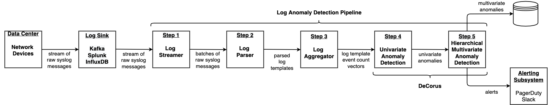 Multivariate anomaly detection can be used to identify outages within large volumes of telemetry data for computing systems. However, developing an efficient anomaly detector that can provide users with relevant information is a challenging problem. We introduce our approach to hierarchical multivariate anomaly detection called DeCorus, a statistical multivariate anomaly detector which achieves linear complexity. It extends standard statistical techniques to improve their ability to find relevant anomalies within noisy signals and makes use of types of domain knowledge that system operators commonly possess to compute system-level anomaly scores. We describe the implementation of DeCorus an online log anomaly detection tool for network device syslog messages deployed at a cloud service provider. We use real-world data sets that consist of $1.5$ billion network device syslog messages and hundreds of incident tickets to characterize the performance of DeCorus and compare its ability to detect incidents with five alternative anomaly detectors. While DeCorus outperforms the other anomaly detectors, all of them are challenged by our data set. We share how DeCorus provides value in the field and how we plan to improve its incident detection accuracy.