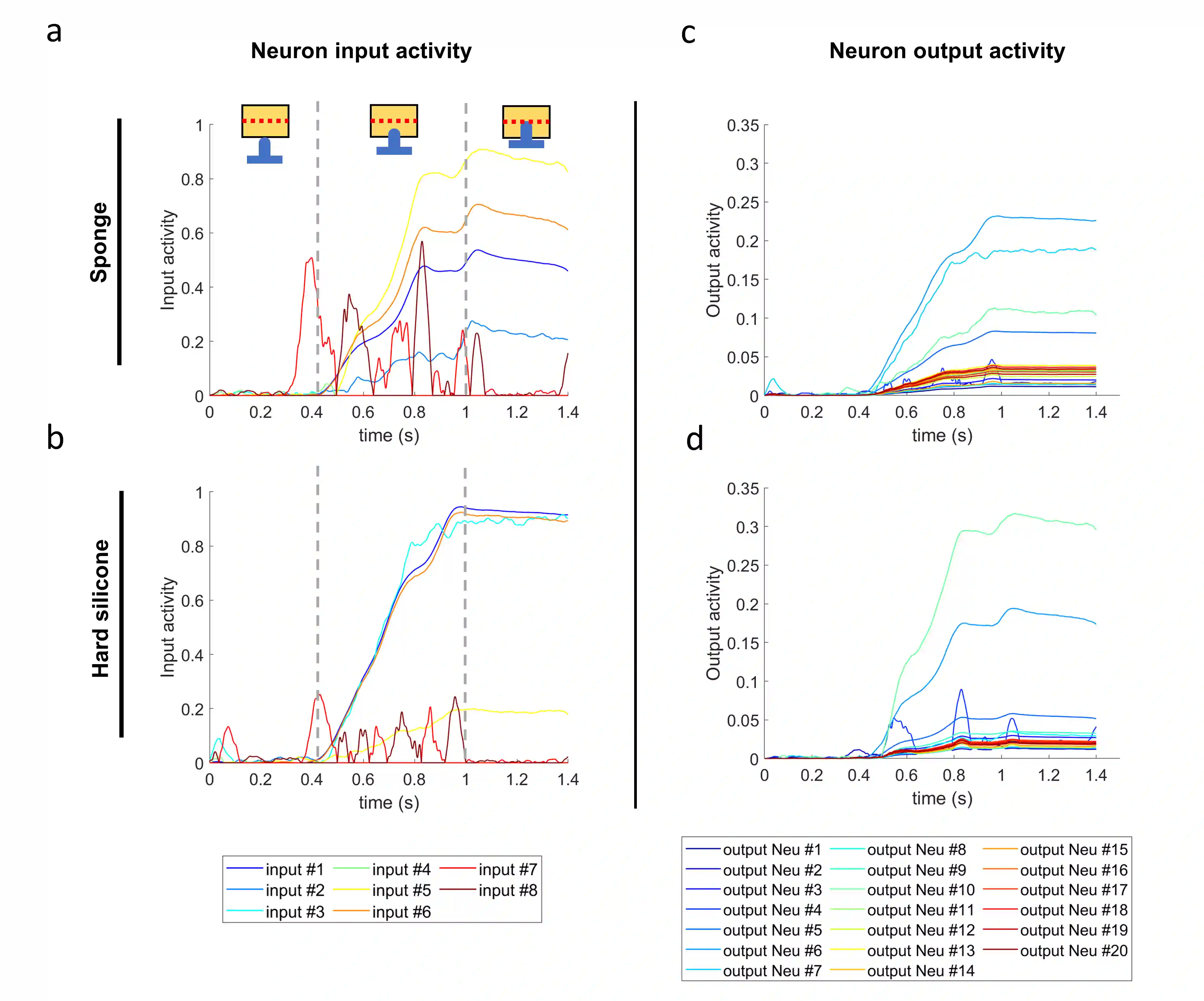 Biological cortical networks are potentially fully recurrent networks without any distinct output layer, where recognition may instead rely on the distribution of activity across its neurons. Because such biological networks can have rich dynamics, they are well-designed to cope with dynamical interactions of the types that occur in nature, while traditional machine learning networks may struggle to make sense of such data. Here we connected a simple model neuronal network (based on the 'linear summation neuron model' featuring biologically realistic dynamics (LSM), consisting of 10 of excitatory and 10 inhibitory neurons, randomly connected) to a robot finger with multiple types of force sensors when interacting with materials of different levels of compliance. Scope: to explore the performance of the network on classification accuracy. Therefore, we compared the performance of the network output with principal component analysis of statistical features of the sensory data as well as its mechanical properties. Remarkably, even though the LSM was a very small and untrained network, and merely designed to provide rich internal network dynamics while the neuron model itself was highly simplified, we found that the LSM outperformed these other statistical approaches in terms of accuracy.