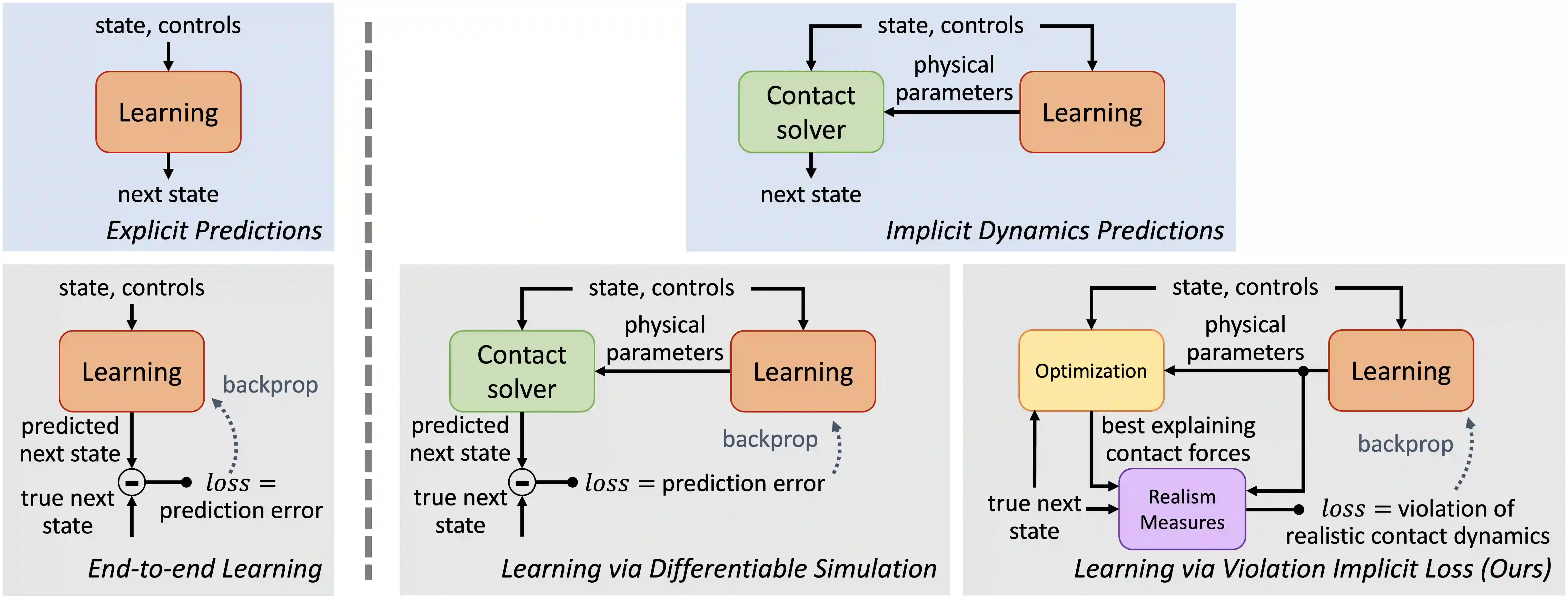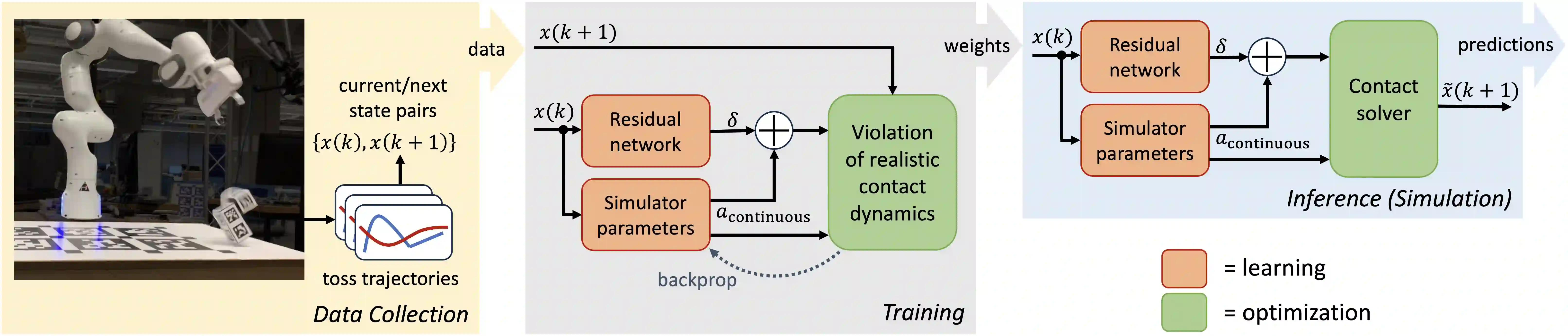 Robotic manipulation can greatly benefit from the data efficiency, robustness, and predictability of model-based methods if robots can quickly generate models of novel objects they encounter. This is especially difficult when effects like complex joint friction lack clear first-principles models and are usually ignored by physics simulators. Further, numerically-stiff contact dynamics can make common model-building approaches struggle. We propose a method to simultaneously learn contact and continuous dynamics of a novel, possibly multi-link object by observing its motion through contact-rich trajectories. We formulate a system identification process with a loss that infers unmeasured contact forces, penalizing their violation of physical constraints and laws of motion given current model parameters. Our loss is unlike prediction-based losses used in differentiable simulation. Using a new dataset of real articulated object trajectories and an existing cube toss dataset, our method outperforms differentiable simulation and end-to-end alternatives with more data efficiency. See our project page for code, datasets, and media: https://sites.google.com/view/continuous-contact-nets/home